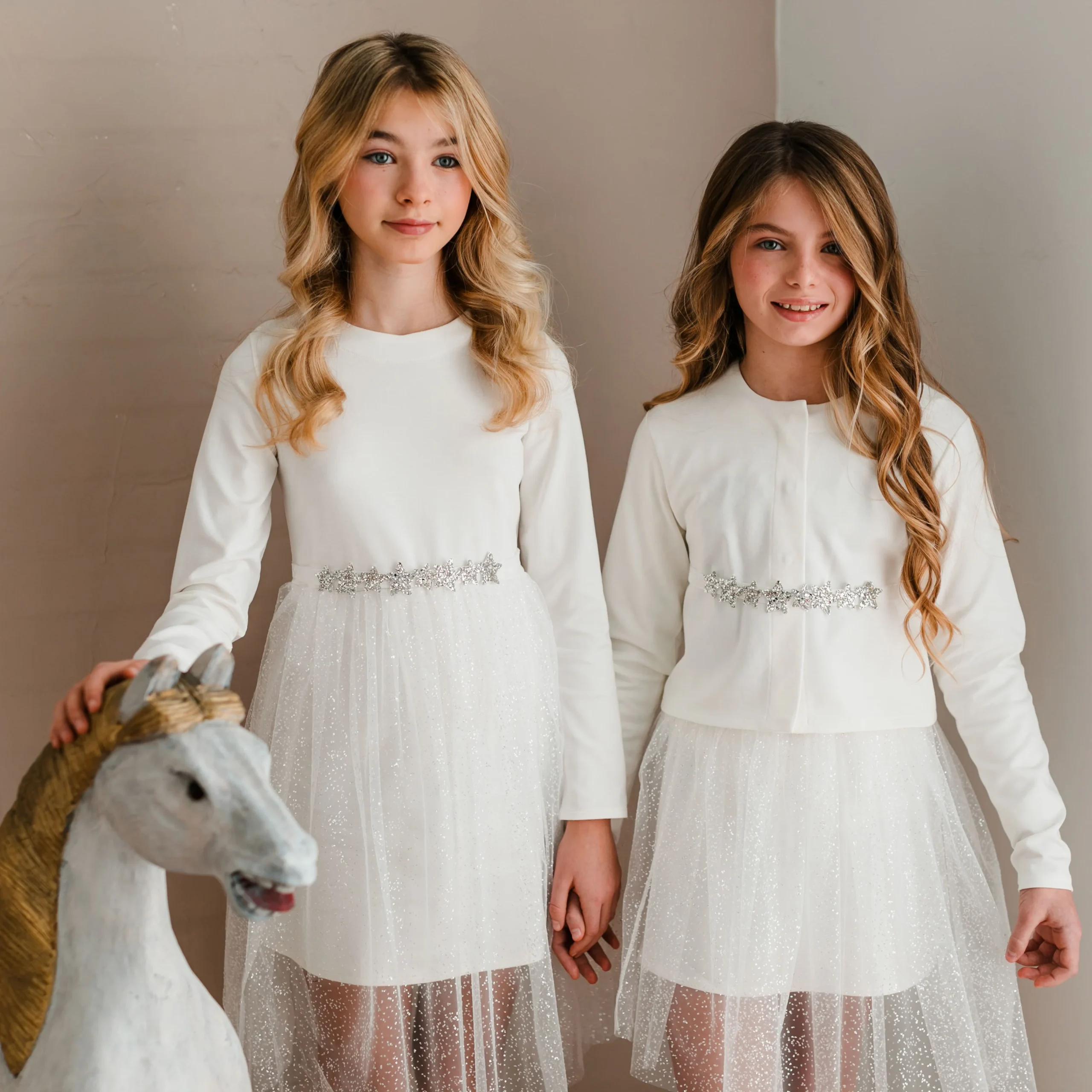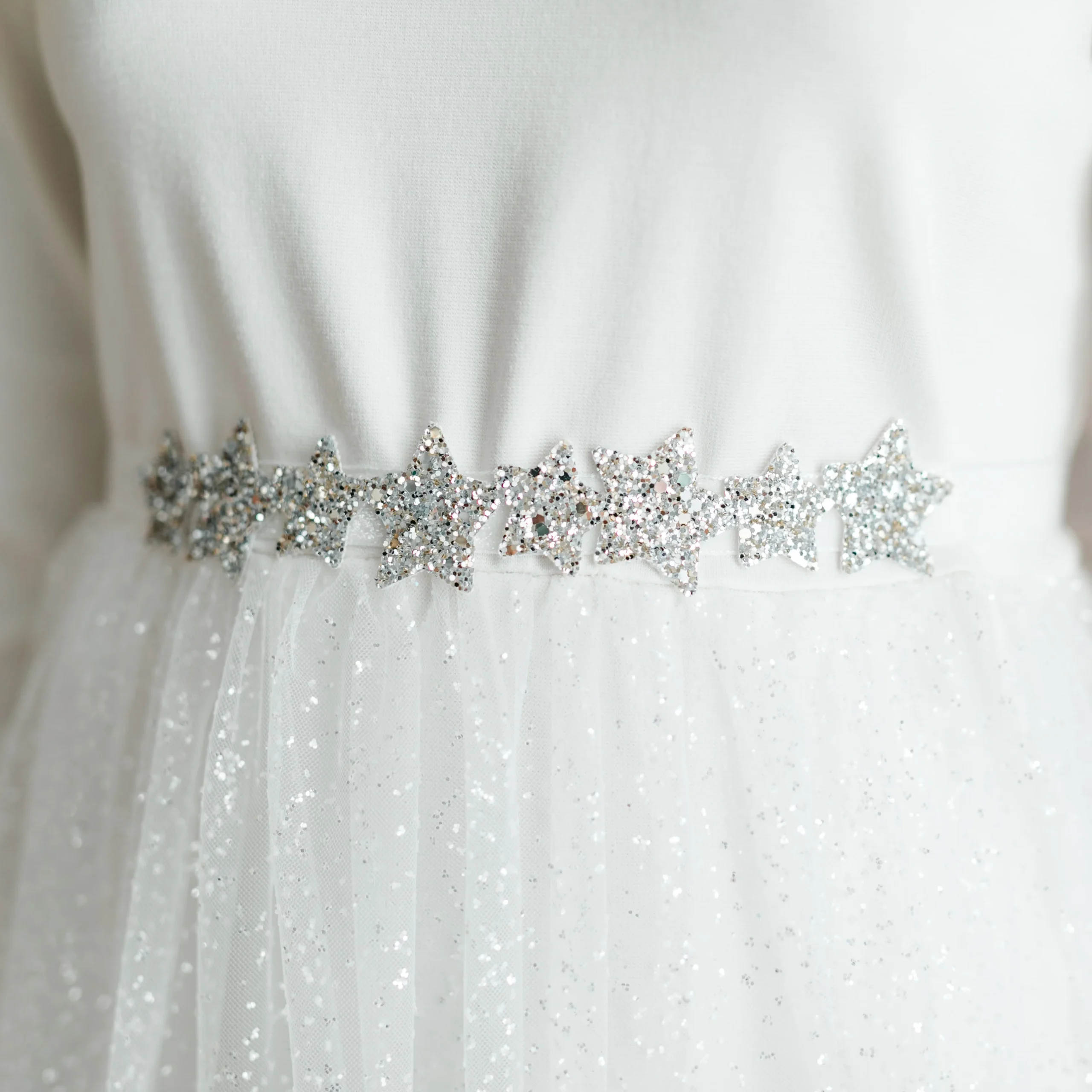 Abito in punto milano bianco, Gonna in tulle glitter, Girocollo, Maniche Lunghe, Chiusura sul retro con bottoncini in madreperla, Dettaglio cintura in velluto con stelline glitter applicate.