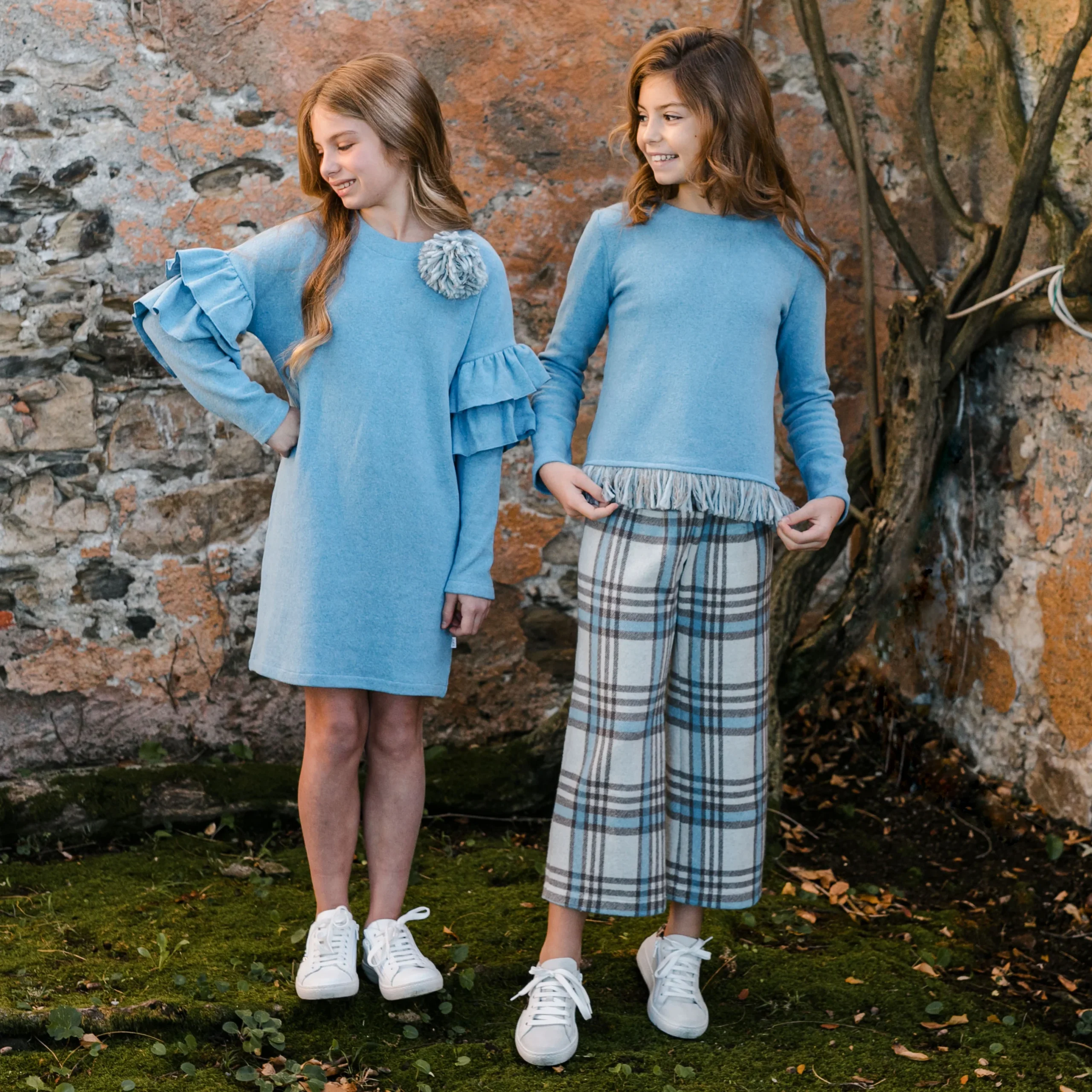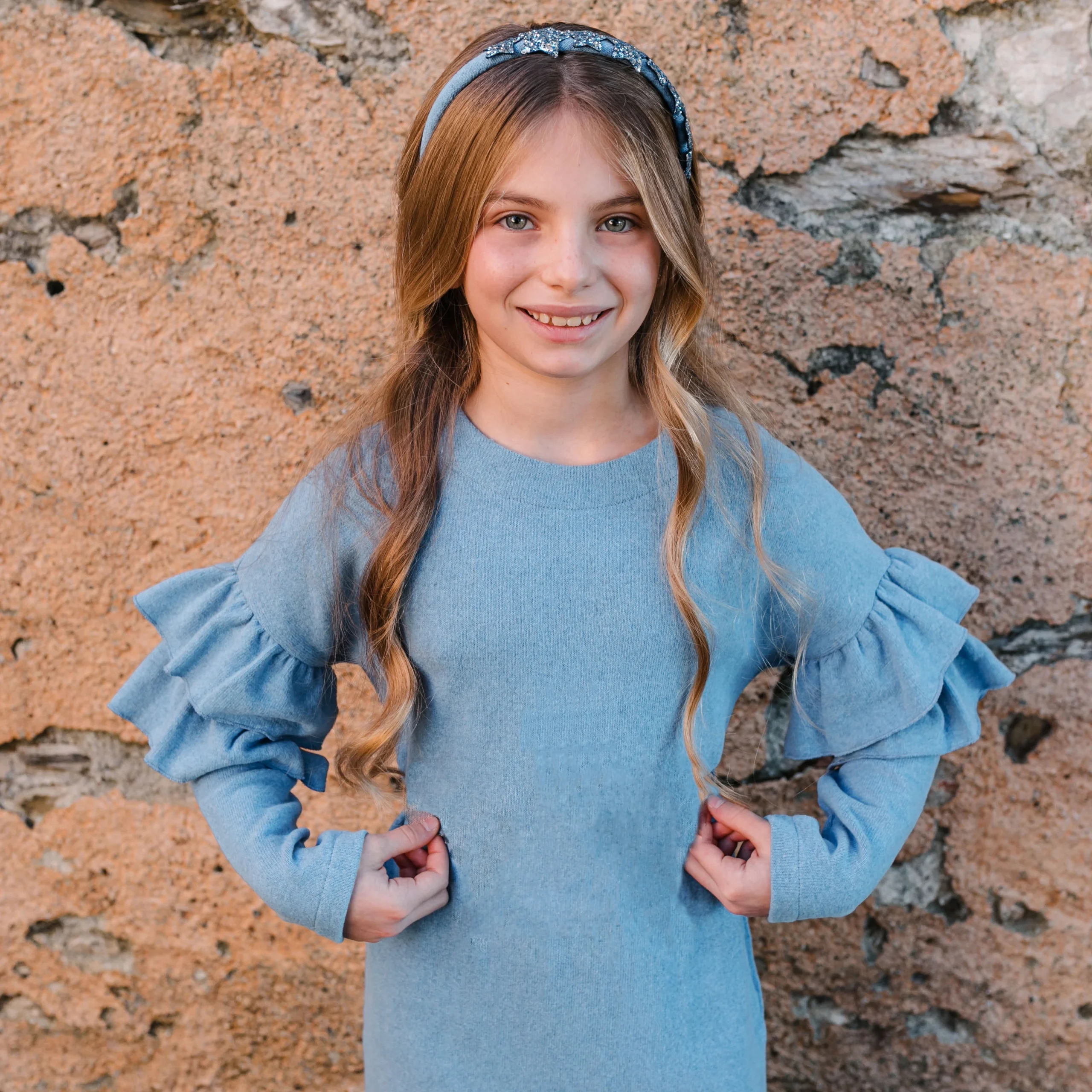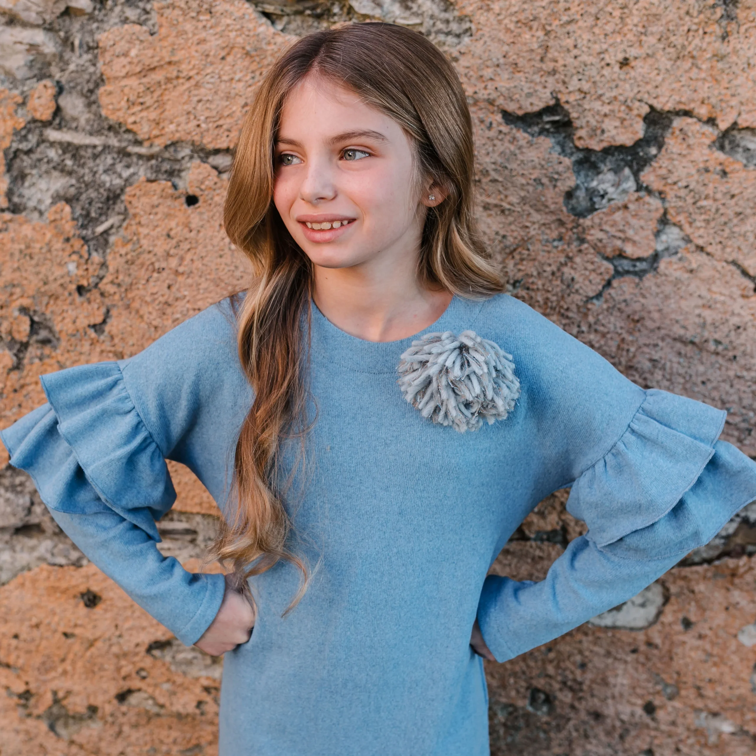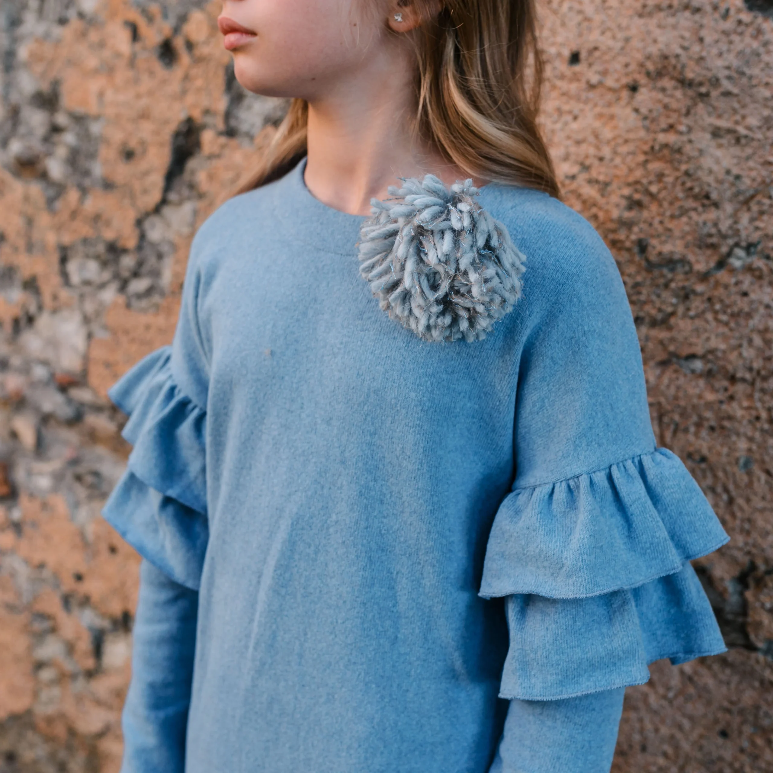 Abito in caldo cotone, Colore: Azzurro, Volant sulle maniche, Spilla pompon rimovibile, Chiusura con bottoncino in madreperla sul retro