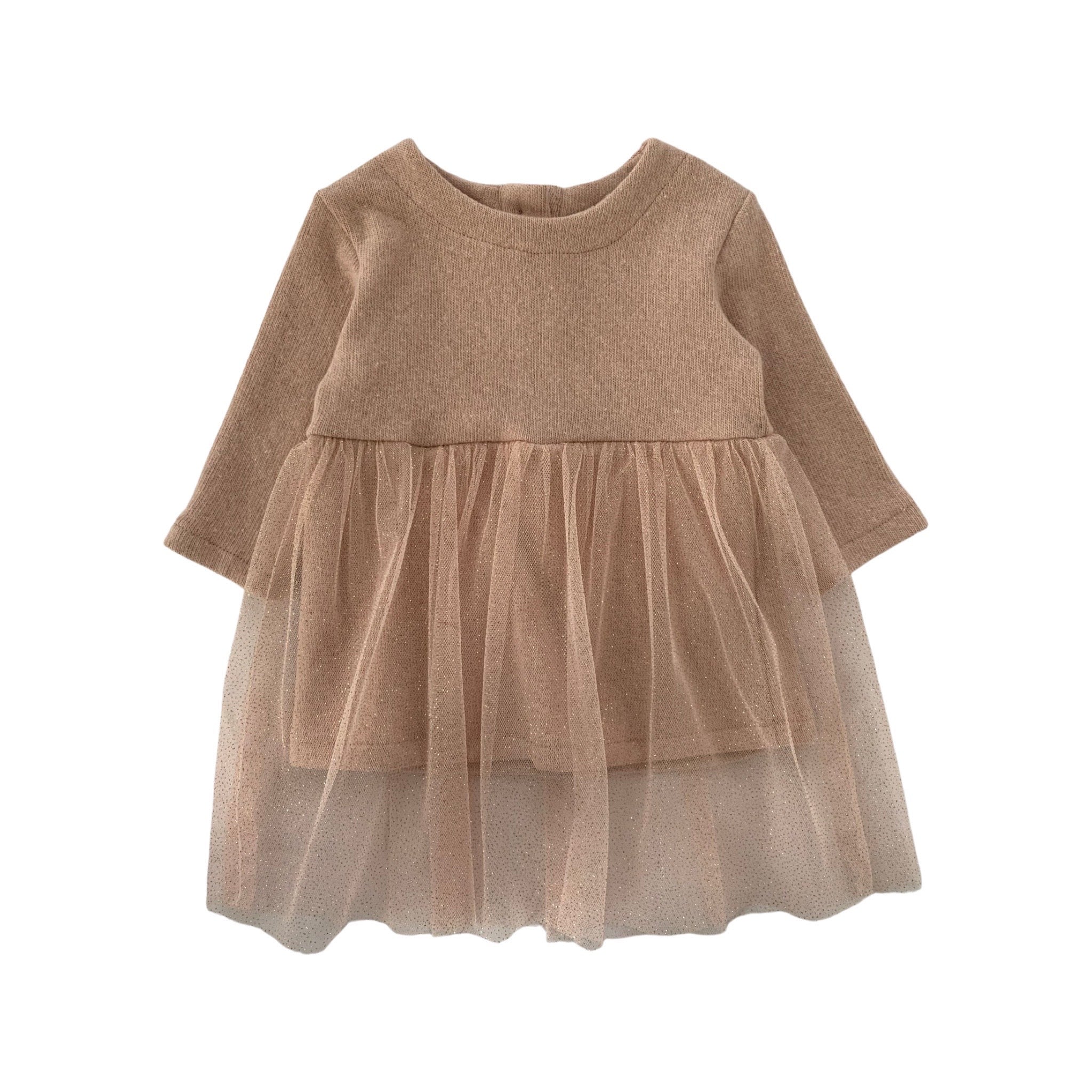Abito in caldo cotone, Girocollo, Tagliato in vita, Gonna in tulle glitter, Chiusura sul retro con bottoncini in madreperla