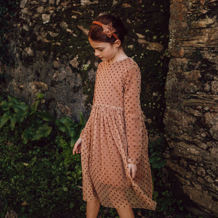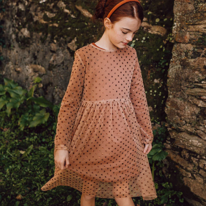 Abito in caldo cotone con aggiunta di abito in tulle con pois glitter, Girocollo,Tagliato in vita, Chiusura sul retro con bottone in madreperla