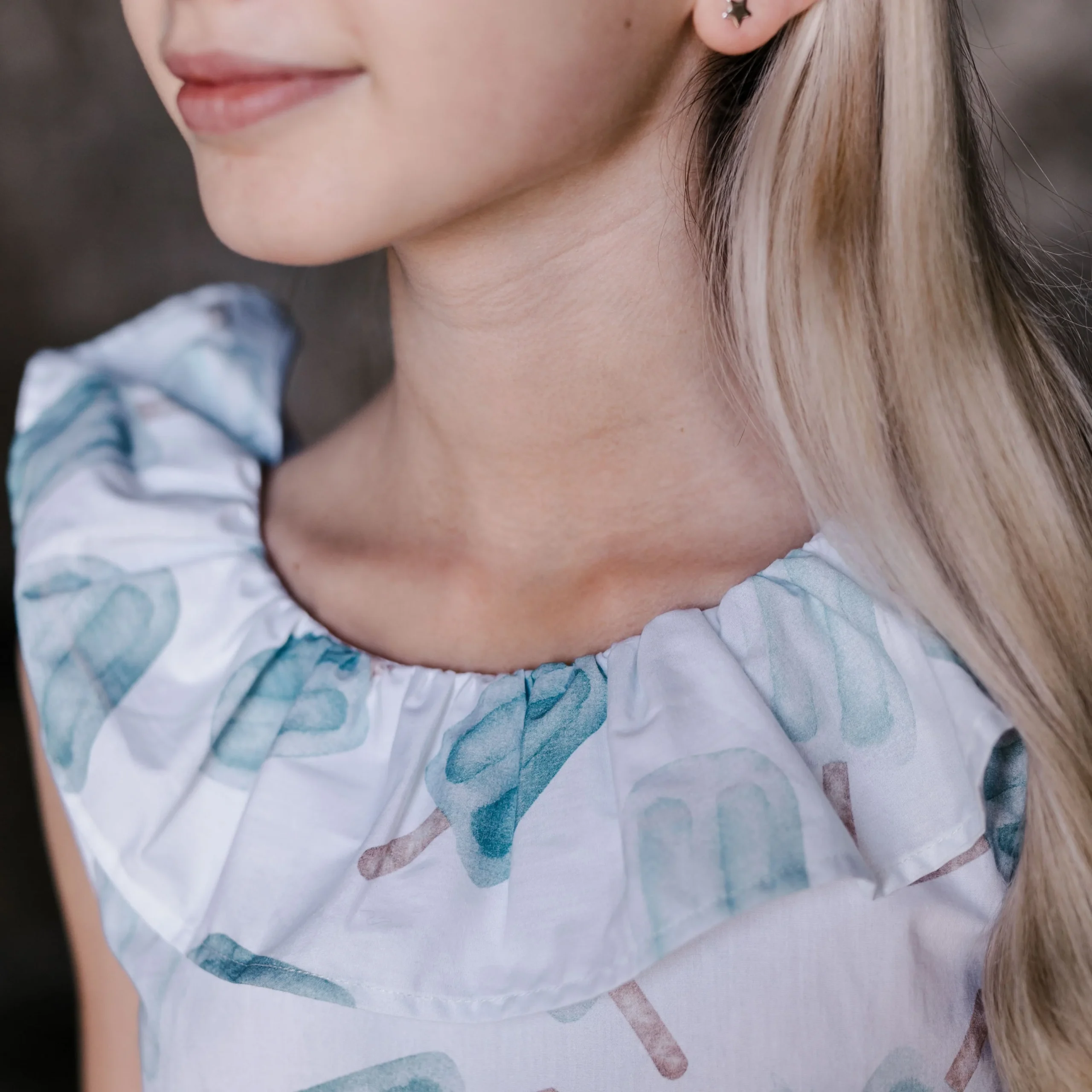 Abito stampato in 100% Cotone, Dettaglio collo con volant, Sfoderato