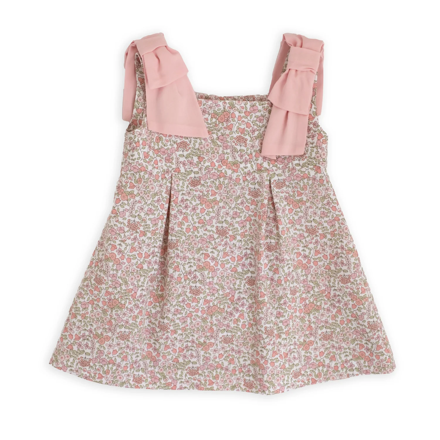 Abito scollo quadrato tessuto fantasia fiorellino, Dettaglio fiocchi spalline, Chiusura sul retro con bottoncini in madreperla