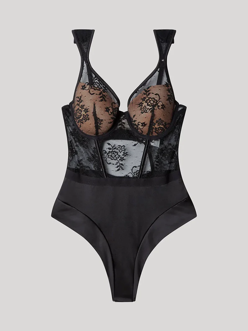 La parte superiore del body è realizzata in pizzo nero dal disegno elegante e ricercato, che dona trasparenza e un tocco sofisticato al décolleté.