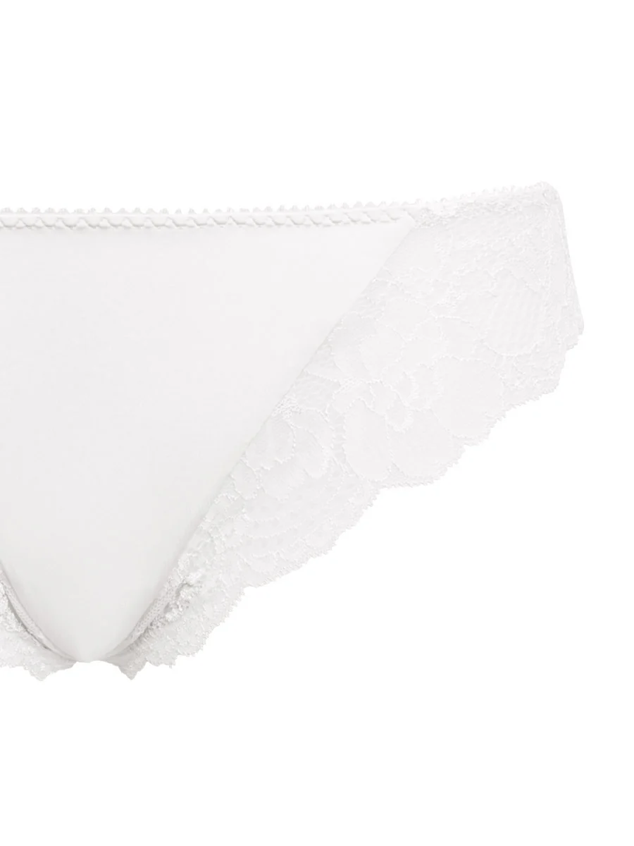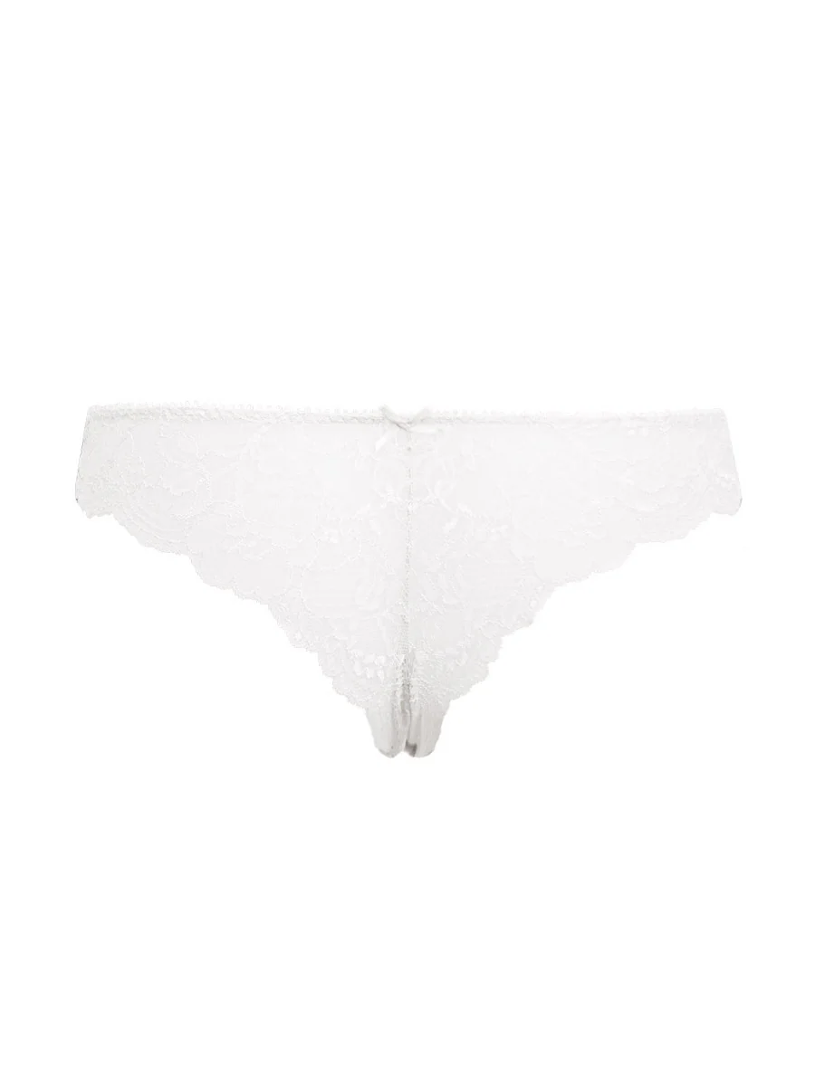 Brasiliana in microfibra stretch semilucida abbinata ad un raffinato pizzo floreale. Dettaglio di fiocchetto in raso