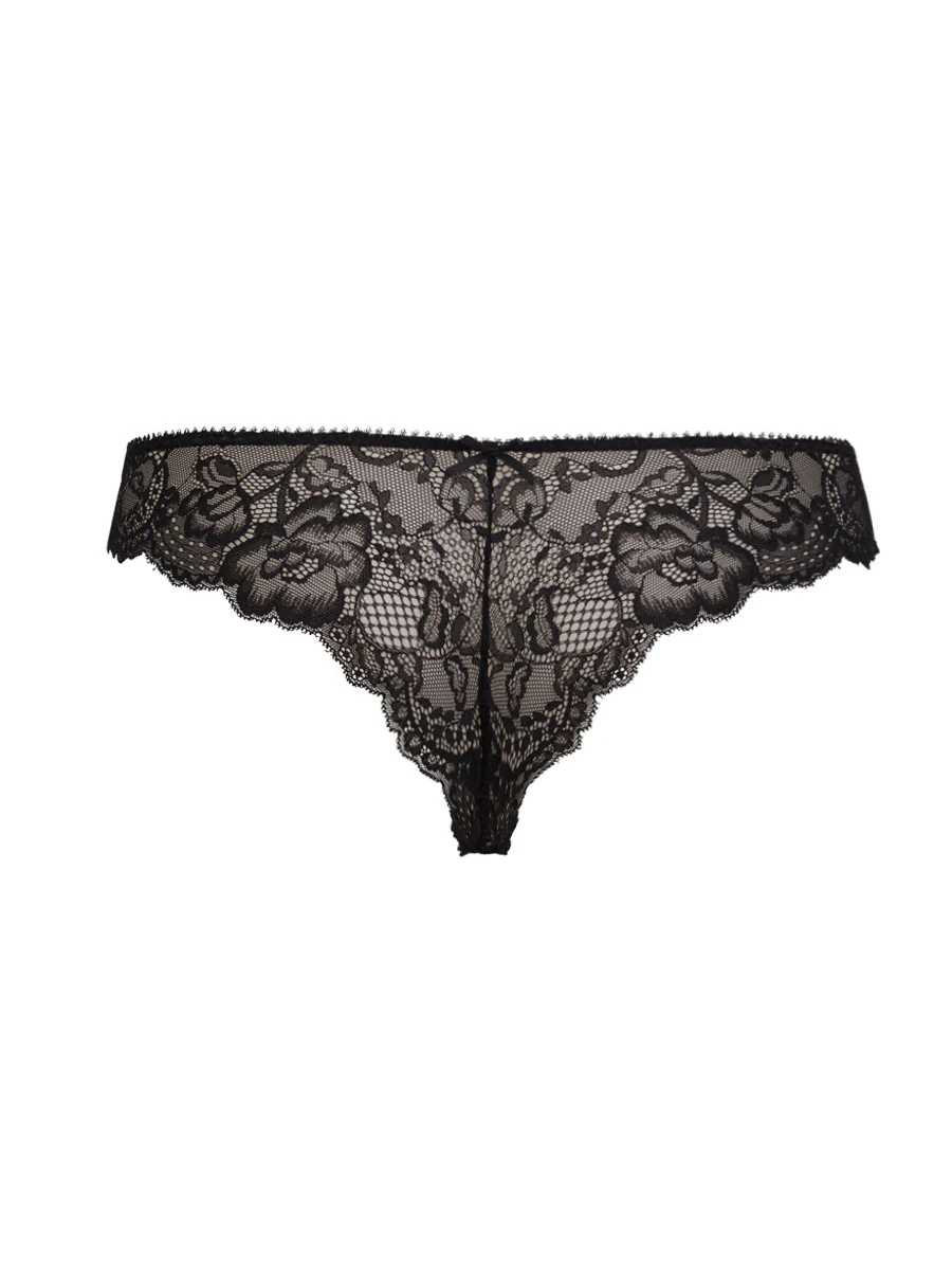 Brasiliana in microfibra stretch semilucida abbinata ad un raffinato pizzo floreale. Dettaglio di fiocchetto in raso