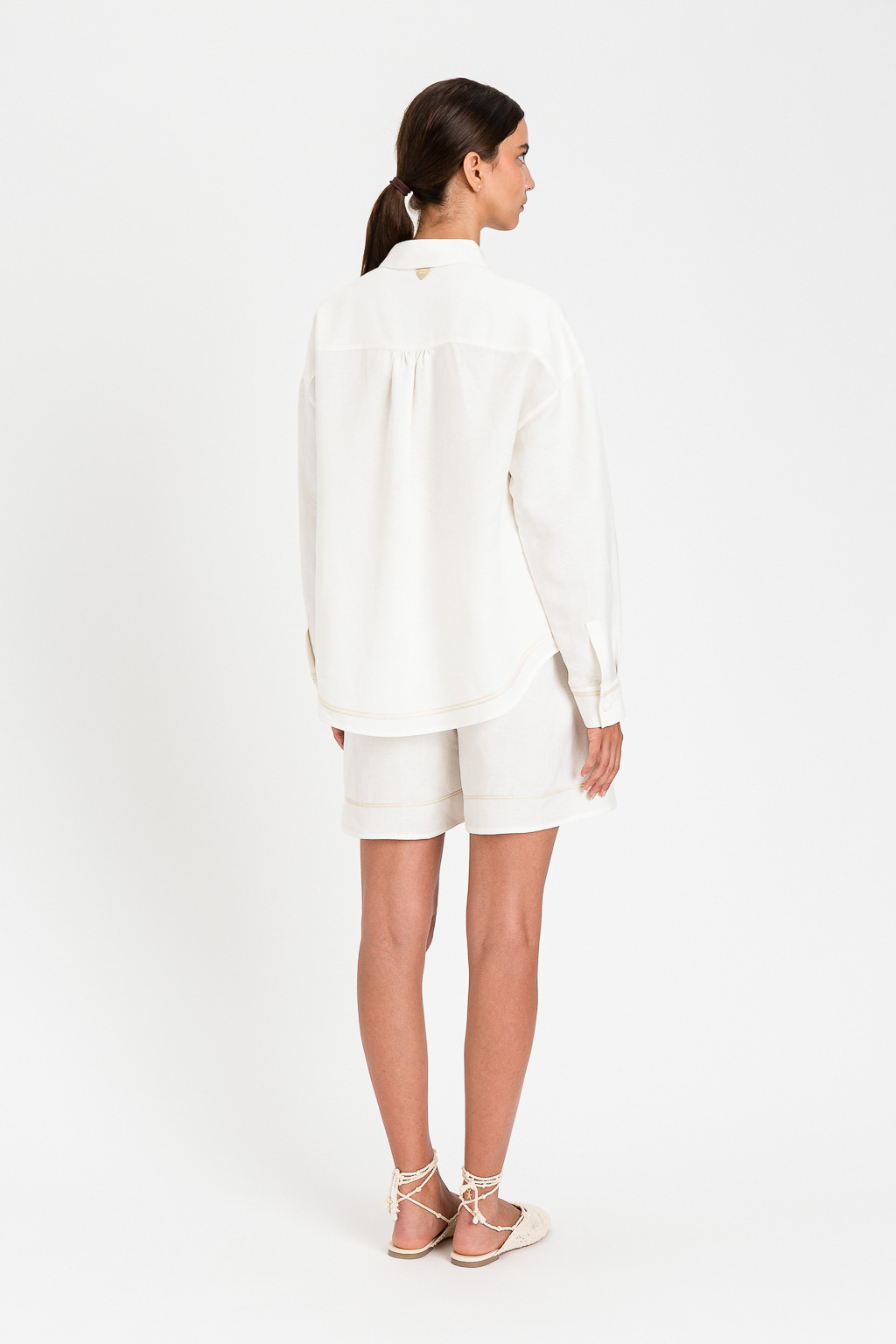 Twinset gioca con la nobiltà del lino e la morbidezza della viscosa per creare una blusa che accarezza la pelle e resiste al calore con estrema classe.