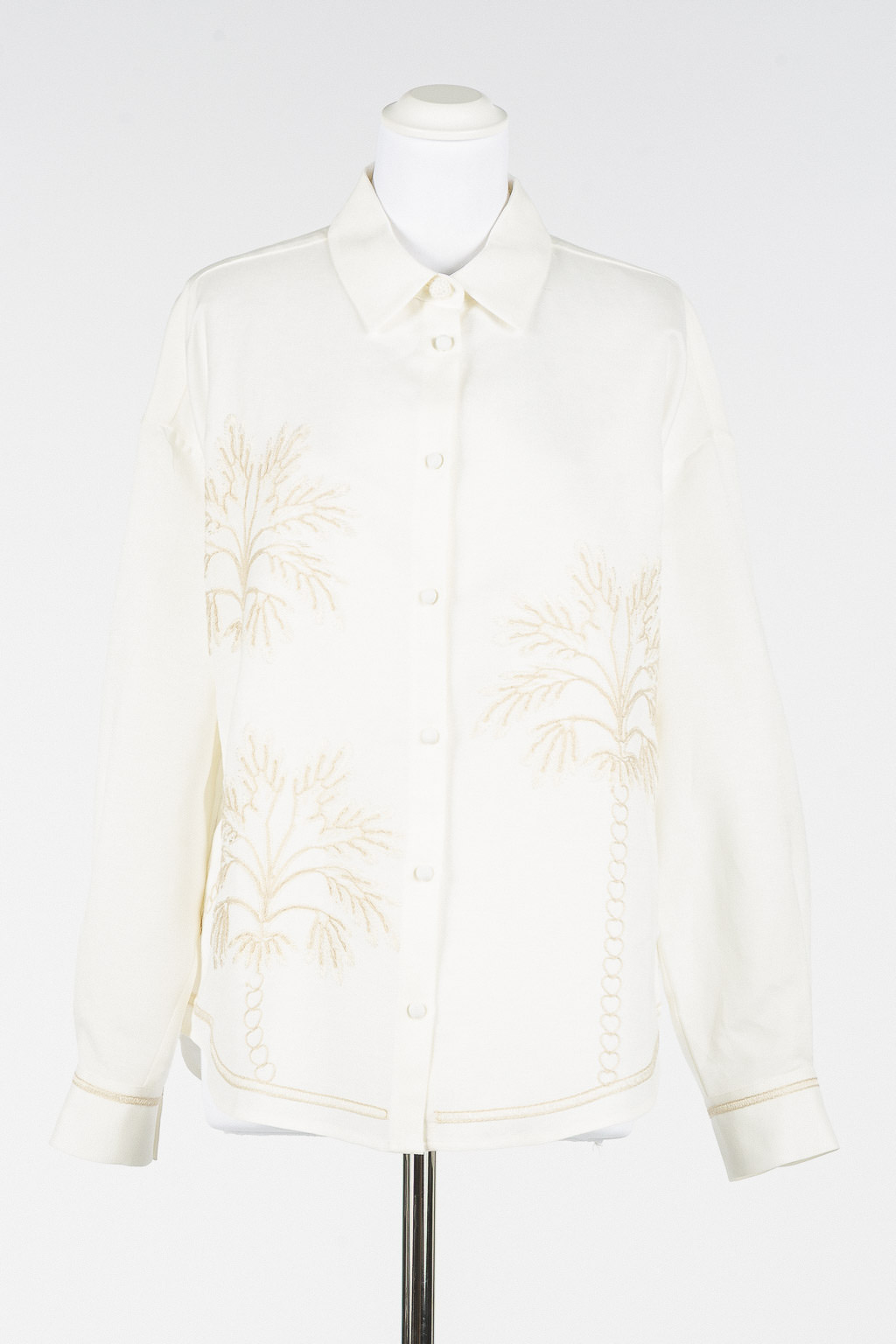 Il colore Vaniglia funge da tela perfetta per il ricamo Fog, che grazie all’uso di fili di diverso spessore sembra quasi animarsi sul tessuto.