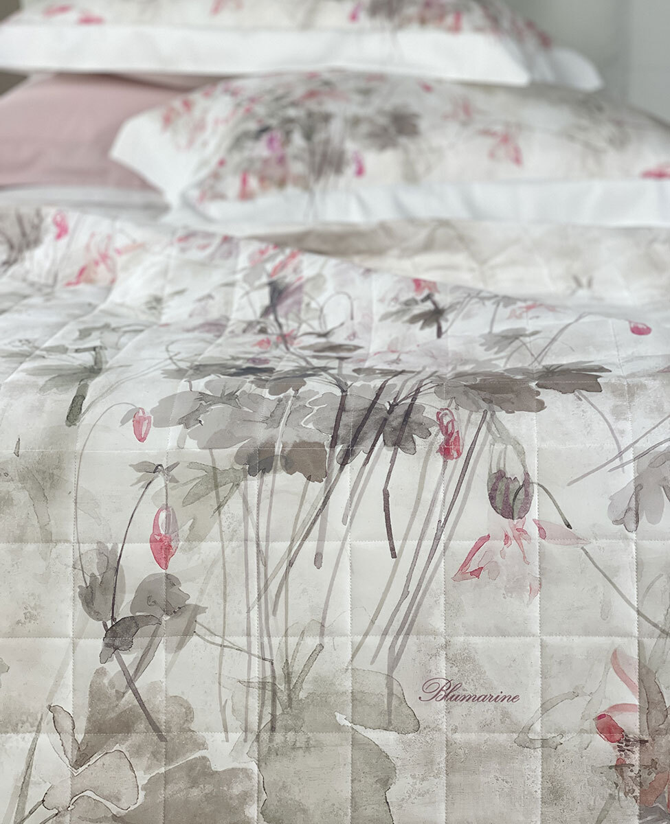 Copriletto trapuntato matrimoniale con stampa all-over su raso di cotone e logo Blumarine stampato nella trama.