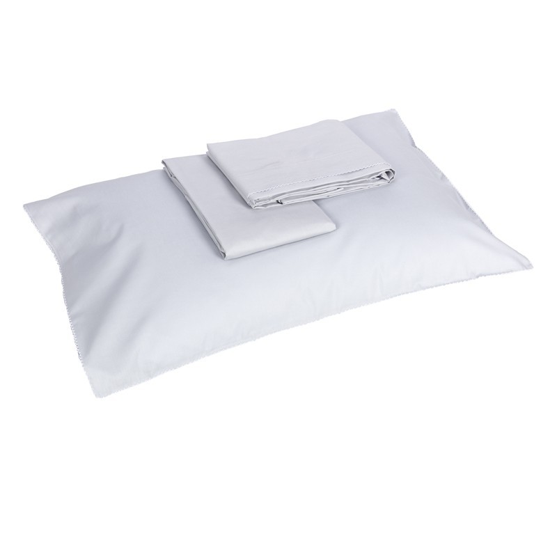 Completo lenzuolo culla realizzato in puro percalle di cotone etichetta ecolabel Made in Italy La balza del lenzuolo e i quattro lati della federa sono impreziositi da lavorazione a crochet. Culla: sopra 90×120 cm – sotto 40×80 cm – federa 28×38 cm