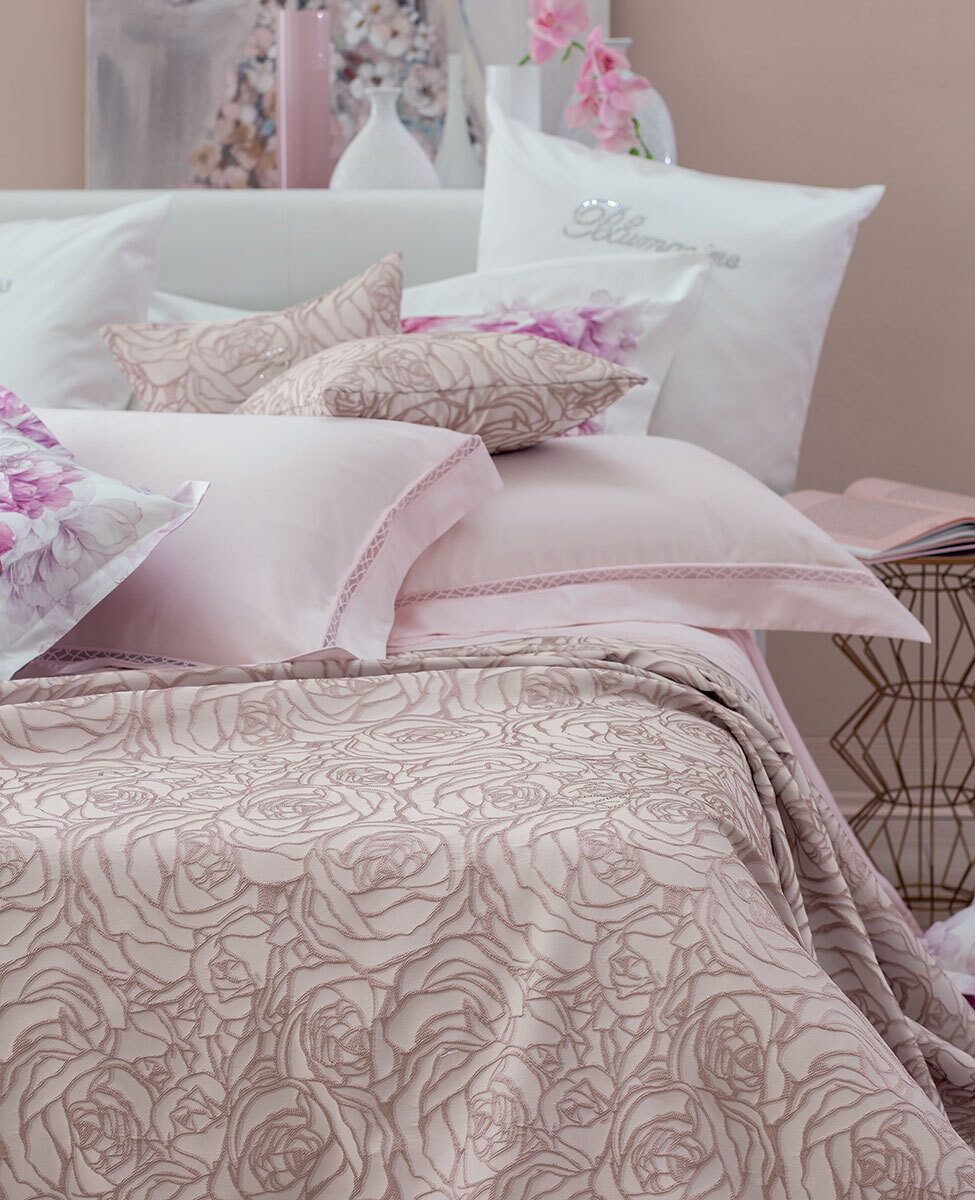 Copriletto matrimoniale liscio, non trapuntato, in jacquard con logo Blumarine in cristalli e angolo stondato in caduta.