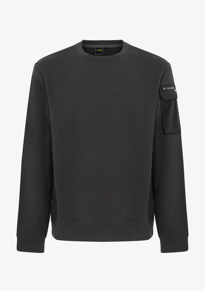 La felpa è realizzata in cotone garzato di alta qualità, un materiale che garantisce morbidezza al tatto e comfort assoluto. Il cotone garzato è perfetto per mantenere la pelle calda nei giorni più freschi, ma allo stesso tempo traspirante, risultando adatta anche per essere indossata in contesti indoor. Il taschino sulla manica, realizzato in tessuto tecnico, è un dettaglio non solo estetico ma anche funzionale: questo materiale resistente aggiunge un tocco moderno al capo e offre la possibilità di tenere a portata di mano piccoli oggetti, come chiavi o auricolari.