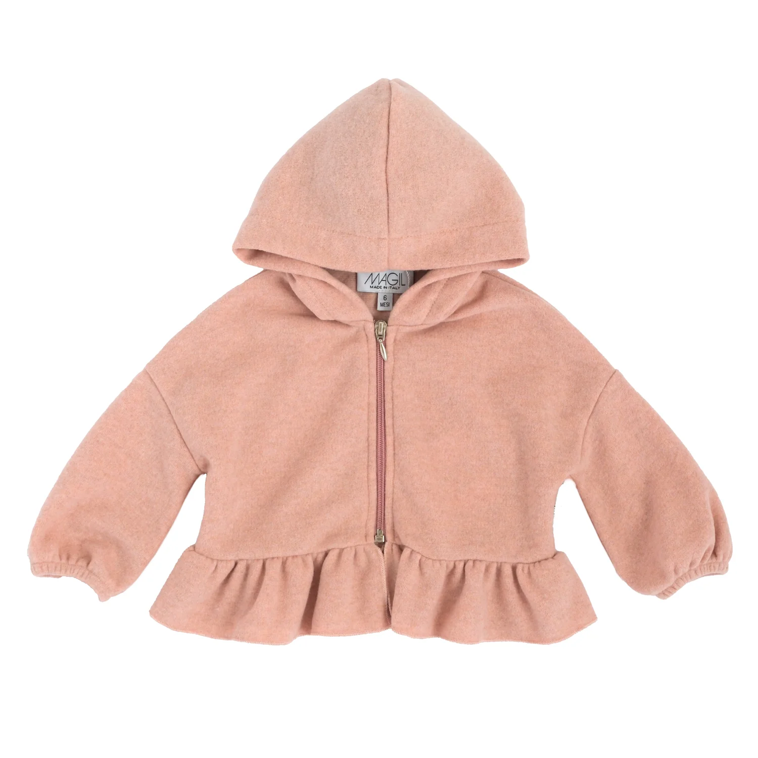 Felpina in punto milano con dettaglio balza, Spalla scesa e polsino con elastico, Dettaglio cappuccio e chiusura frontale con zip