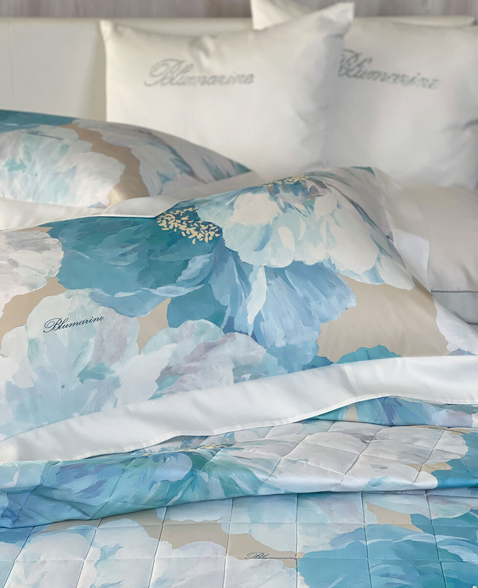 Copriletto trapuntato matrimoniale con stampa all-over su raso di cotone e logo Blumarine stampato nella trama.