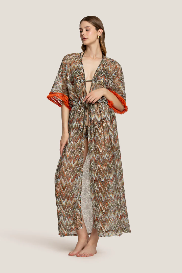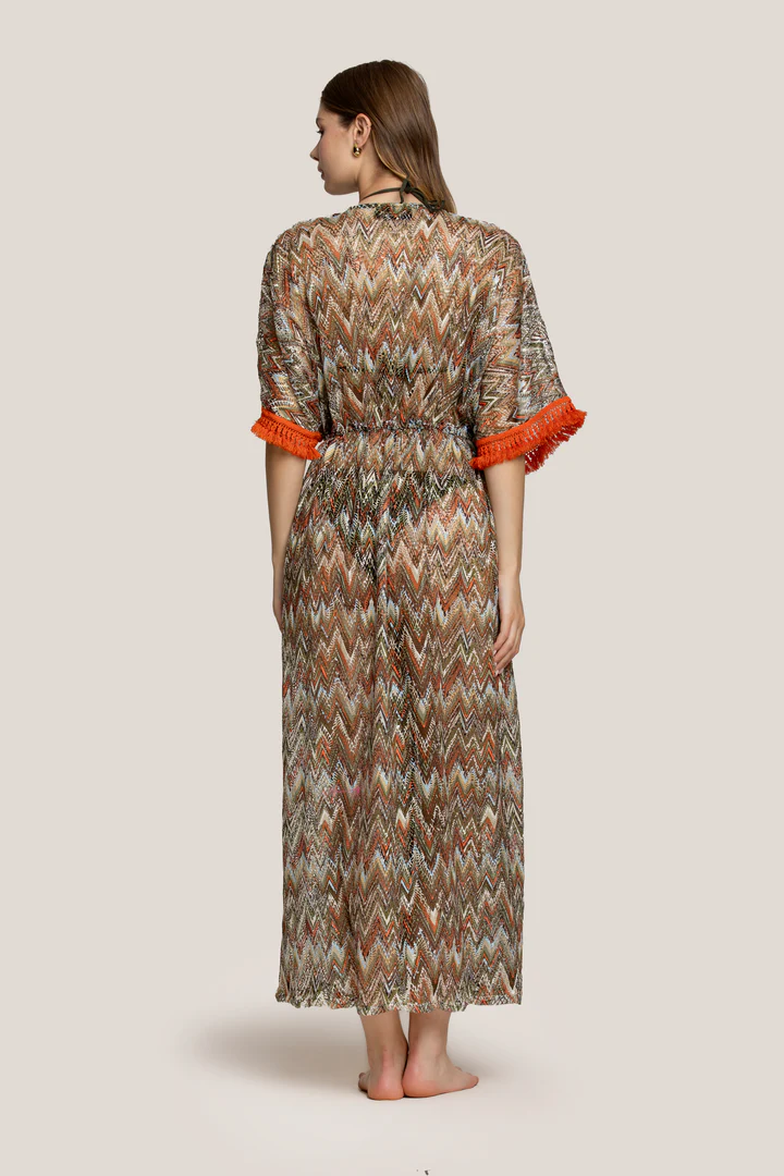 Questo kaftano è il compagno ideale per ogni momento della tua estate: dalla spiaggia al bordo piscina, da una passeggiata al tramonto fino a un brunch all’aperto. Si abbina perfettamente a un costume intero elegante o a un bikini minimal, e può essere completato con sandali flat, cappello a tesa larga e occhiali da sole oversize per un look glamour e rilassato.
