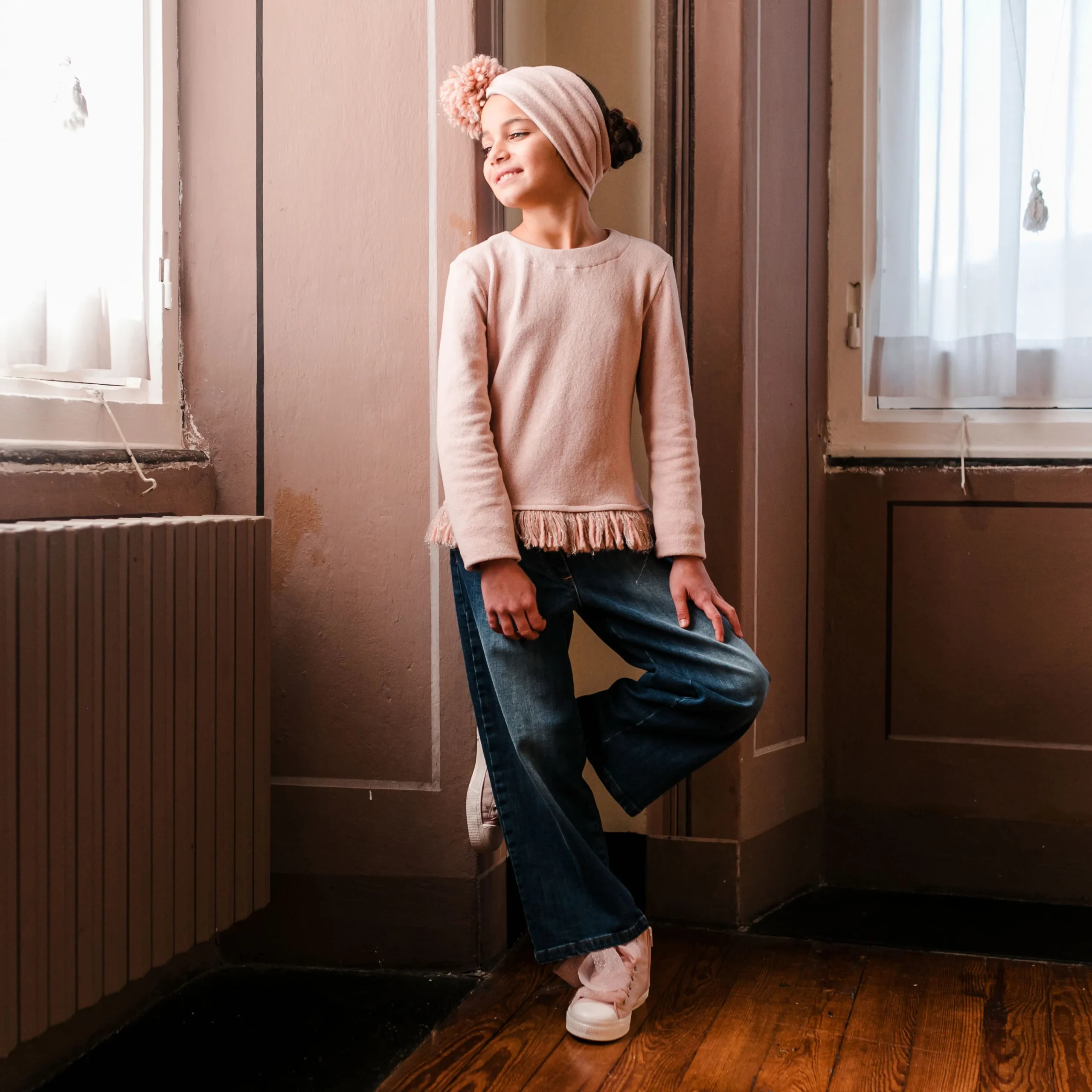 Maglia in caldo cotone, Dettaglio frangia in fondo, Chiusura con bottoncini in madreperla sul retro