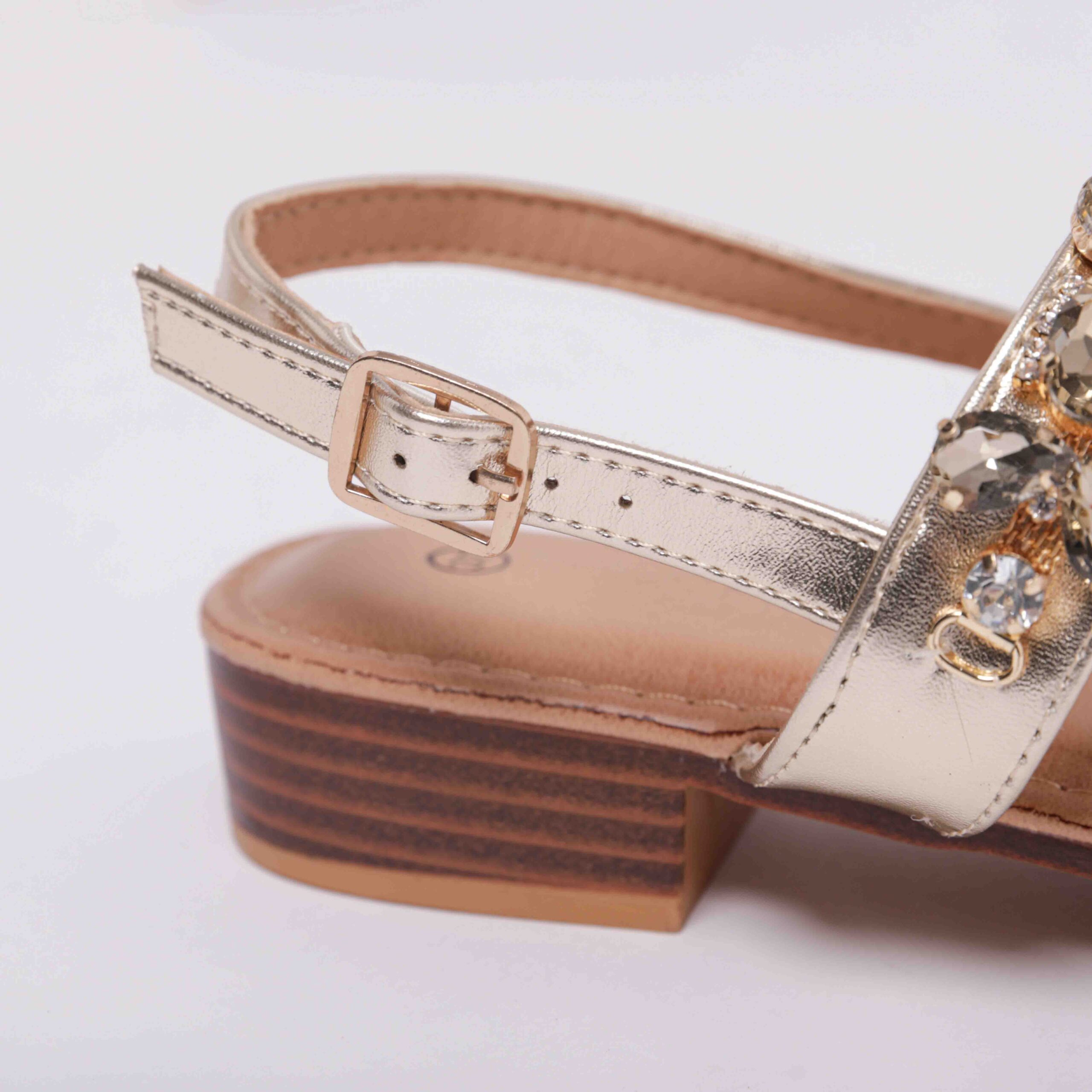 Ha applicazione di strass crystal, galvaniche dorate, chiusura con fibbia e cinturino alla caviglia e il fondo in tunit.