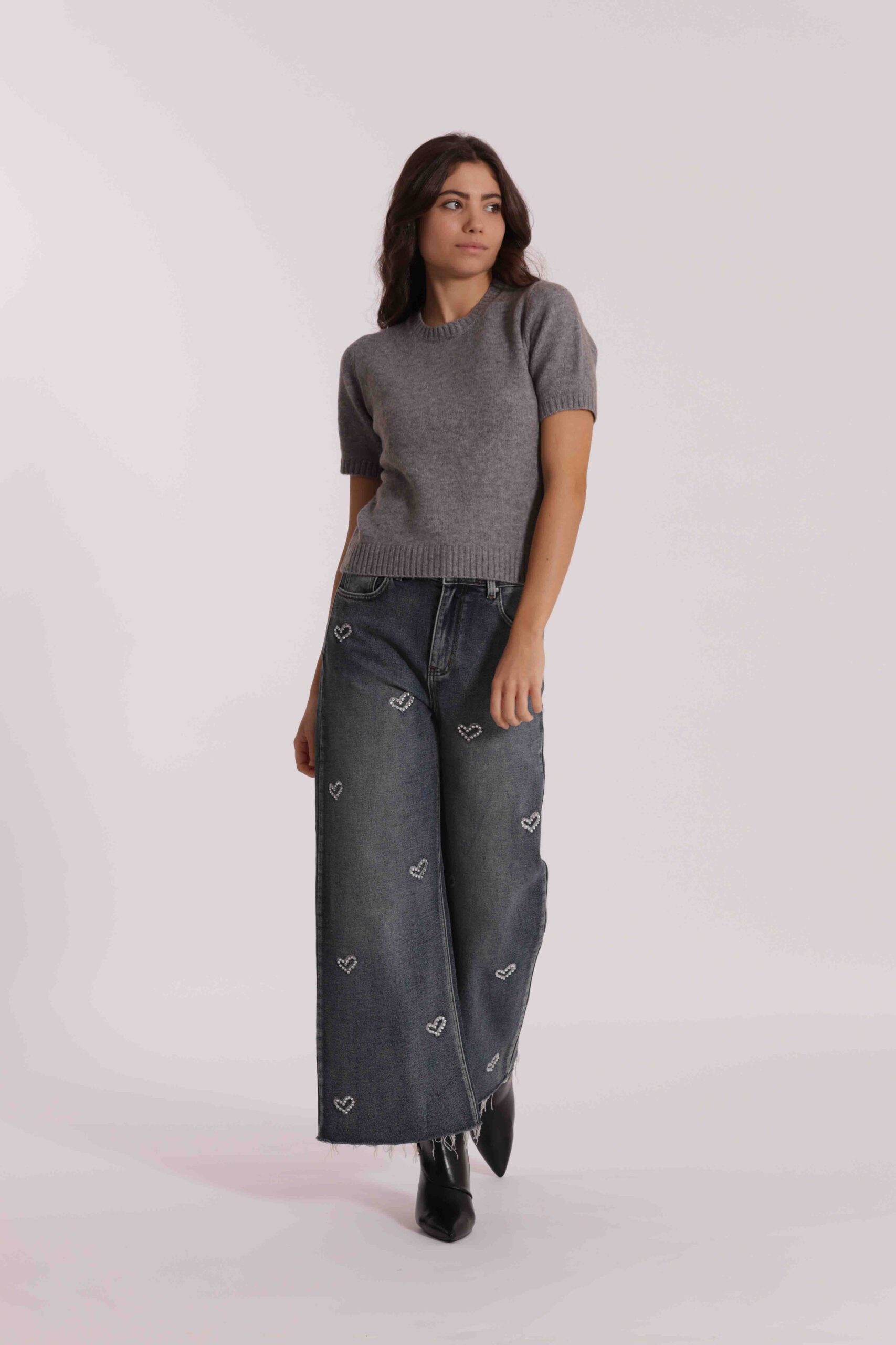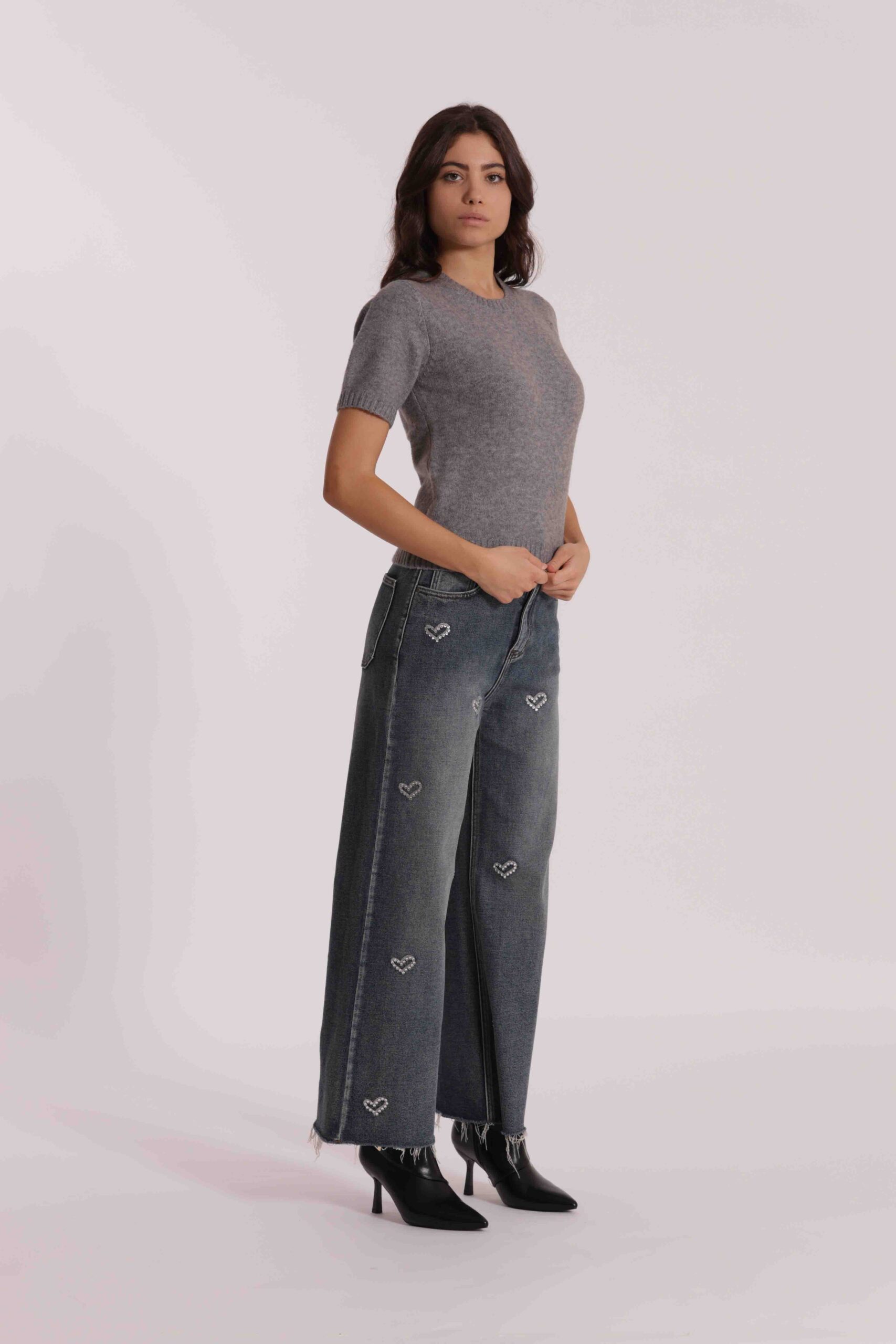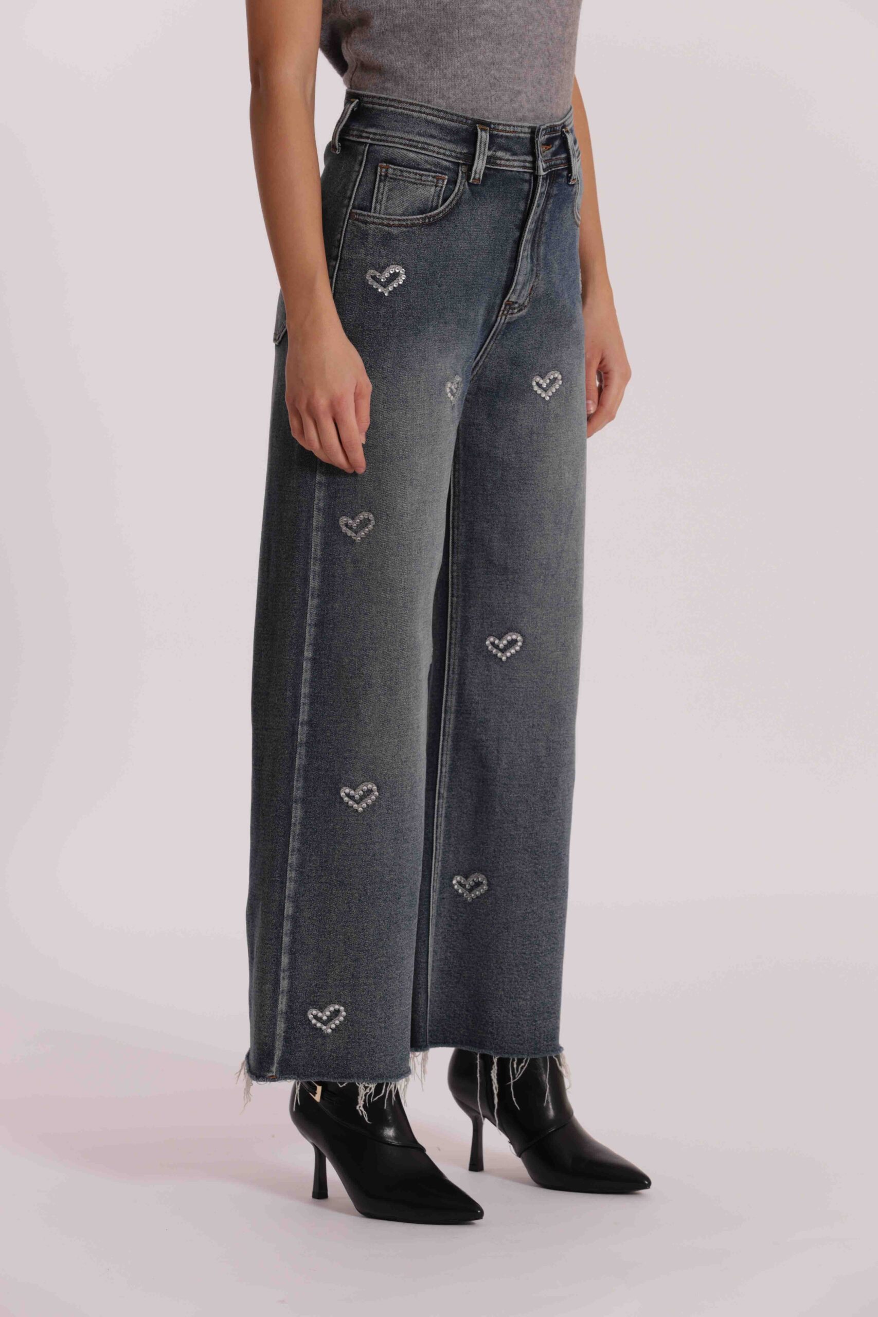 Trend di stagione e base perfetta per una miriade di look è il jeans wide leg con applicazione frontale di cuori in strass.