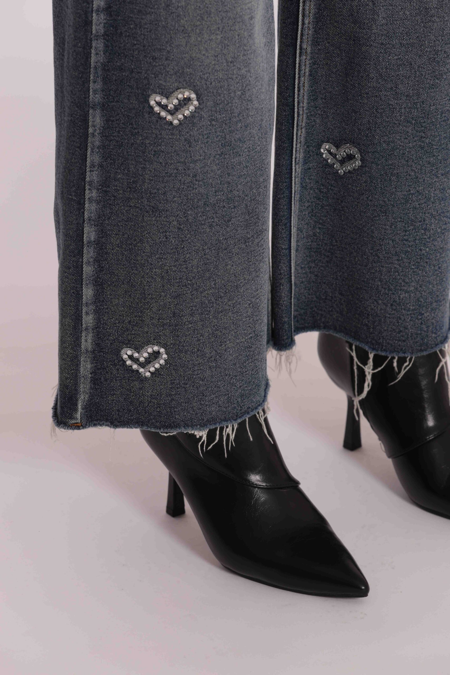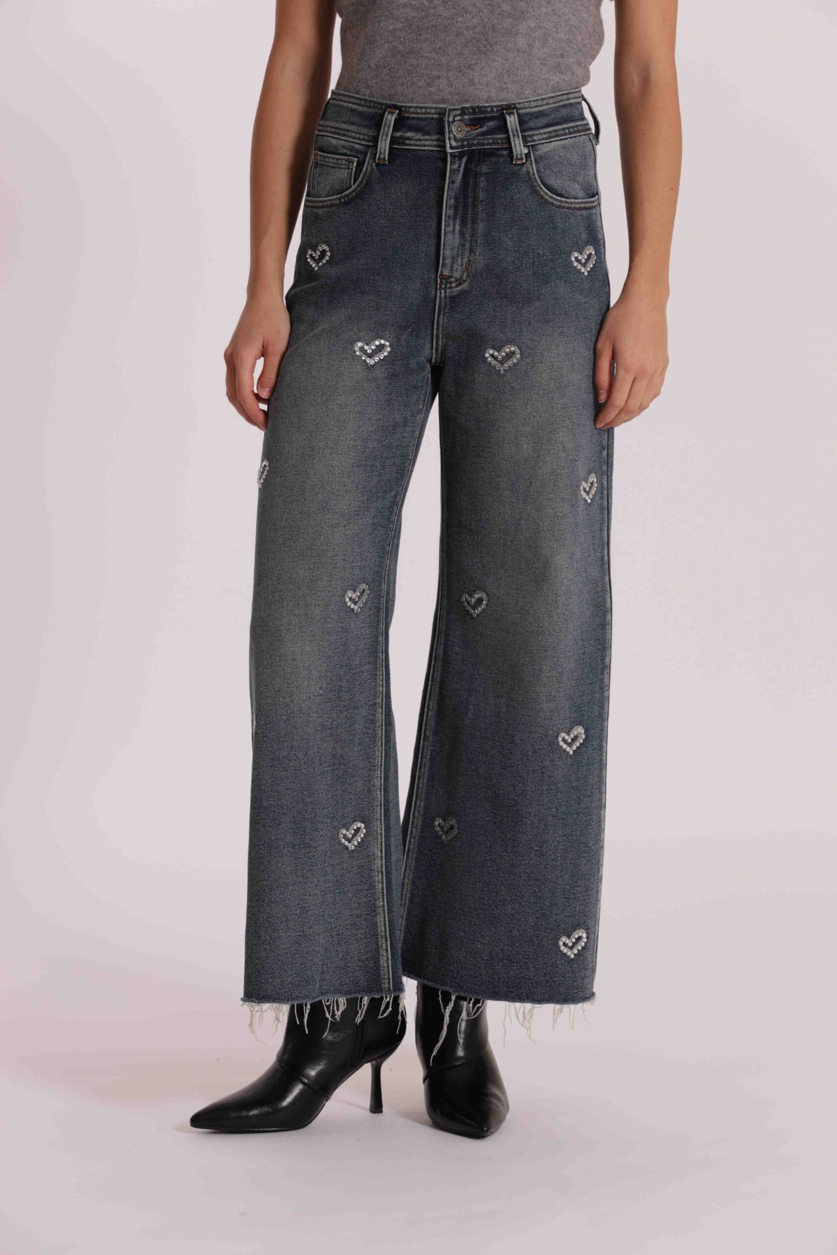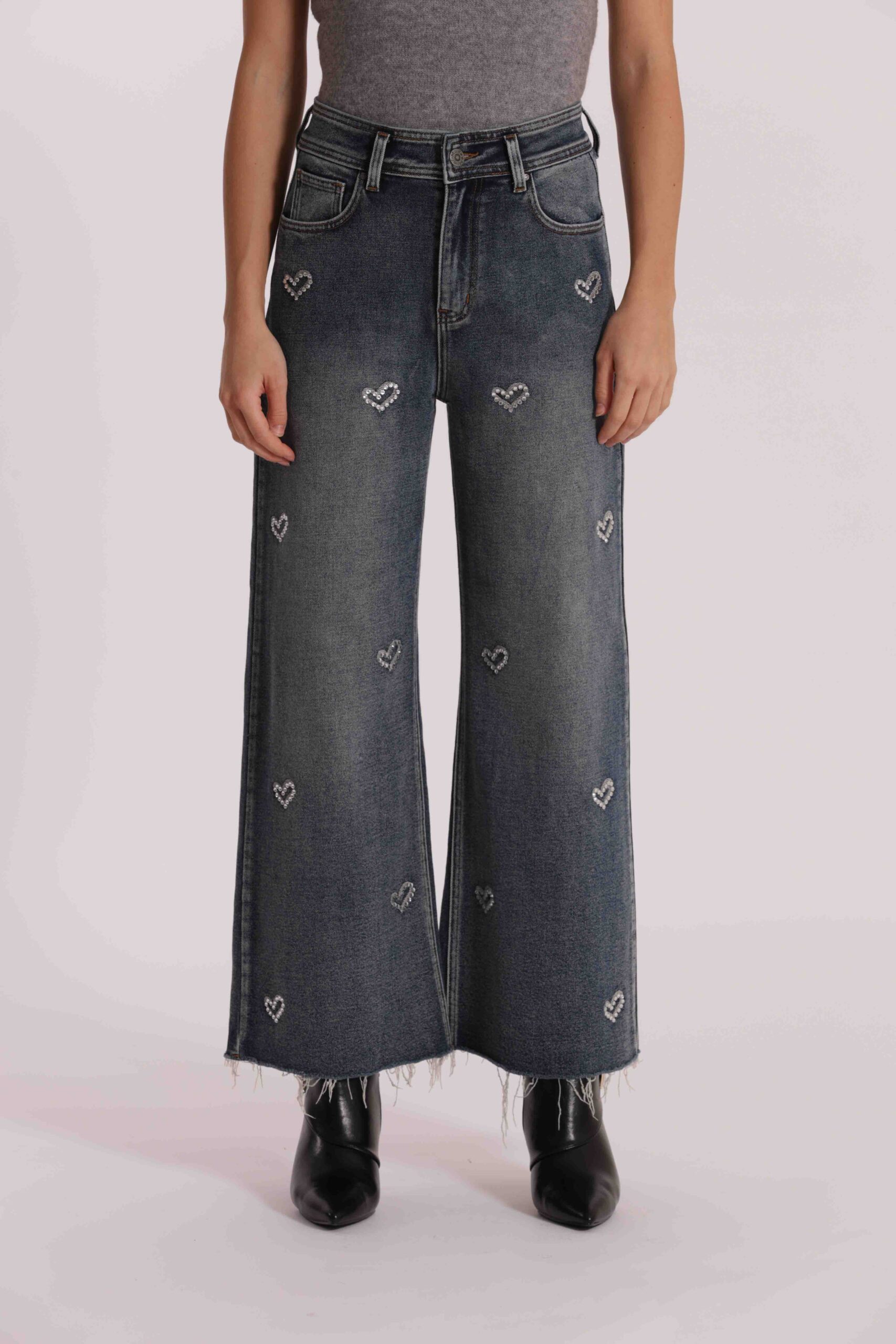 Trend di stagione e base perfetta per una miriade di look è il jeans wide leg con applicazione frontale di cuori in strass.