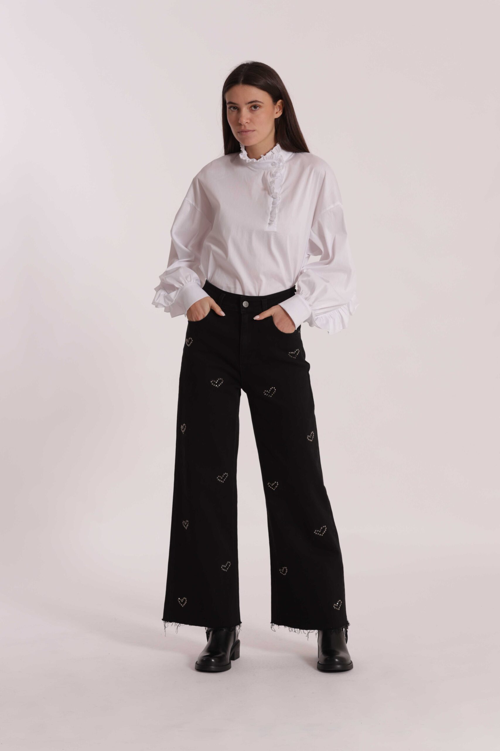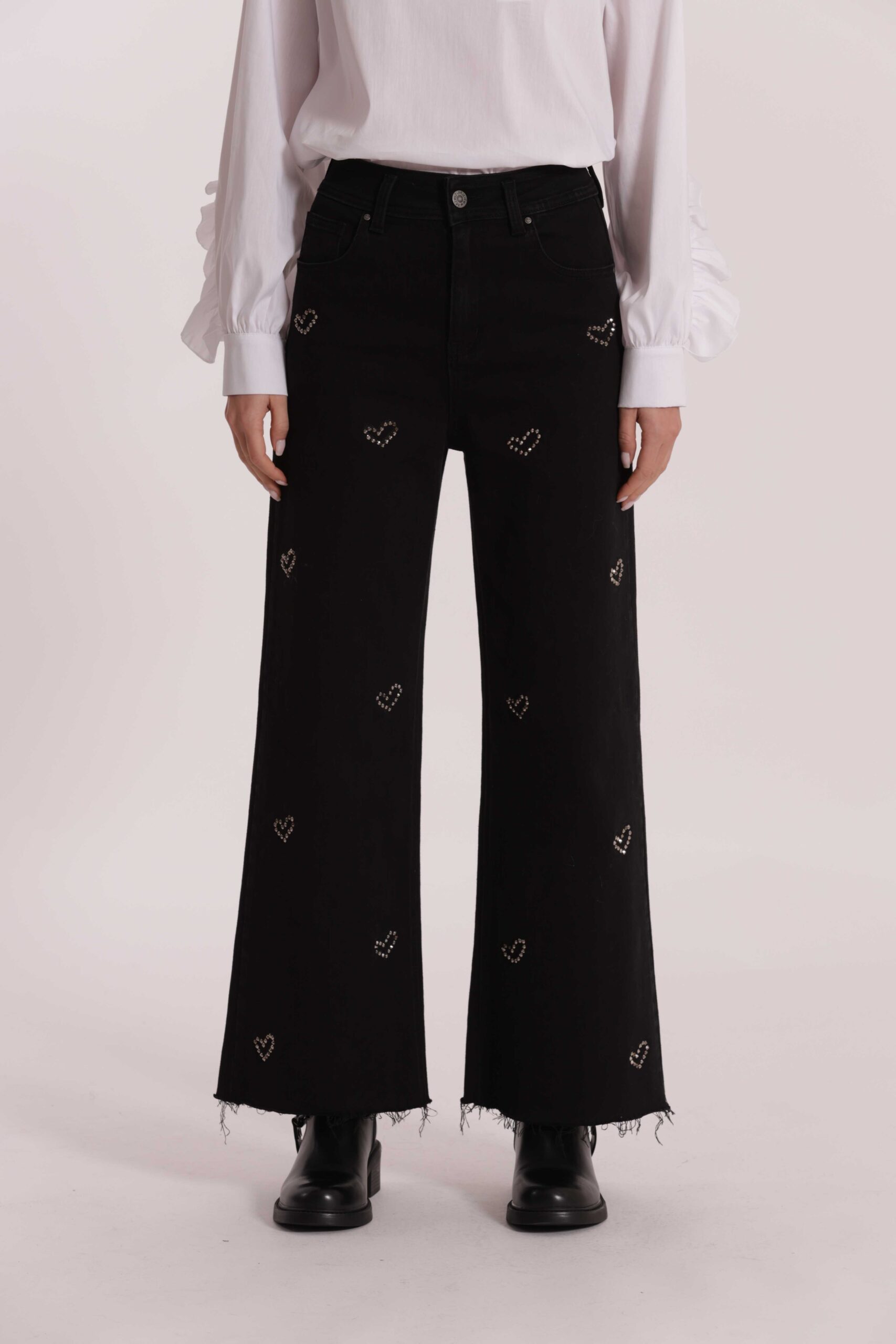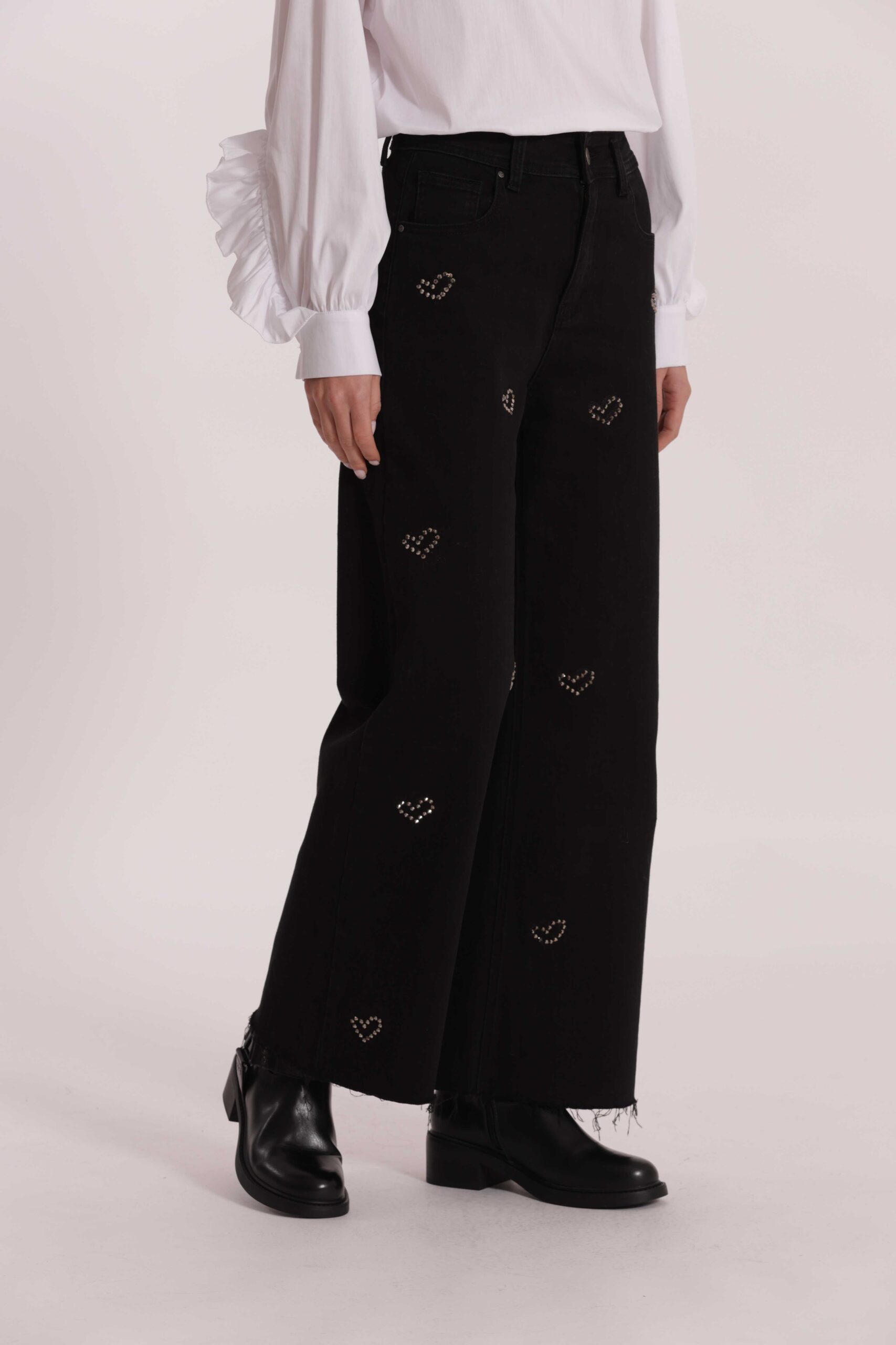 Trend di stagione e base perfetta per una miriade di look è il jeans wide leg con applicazione frontale di cuori in strass.