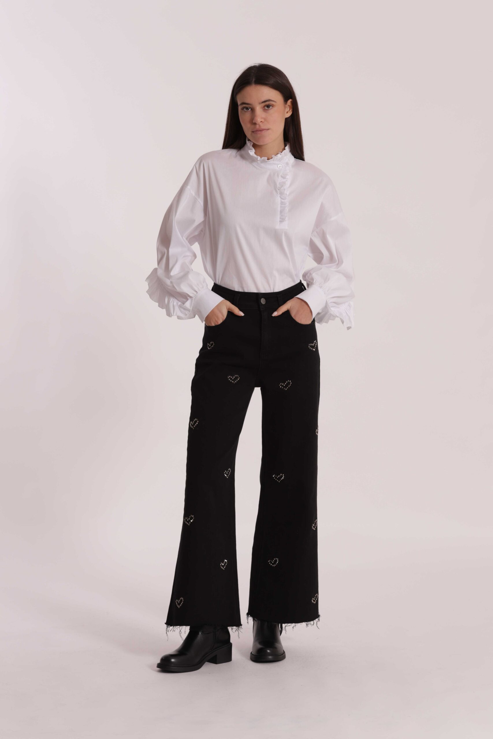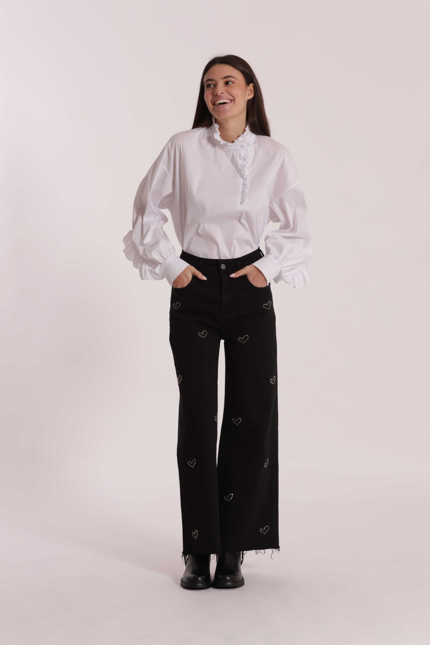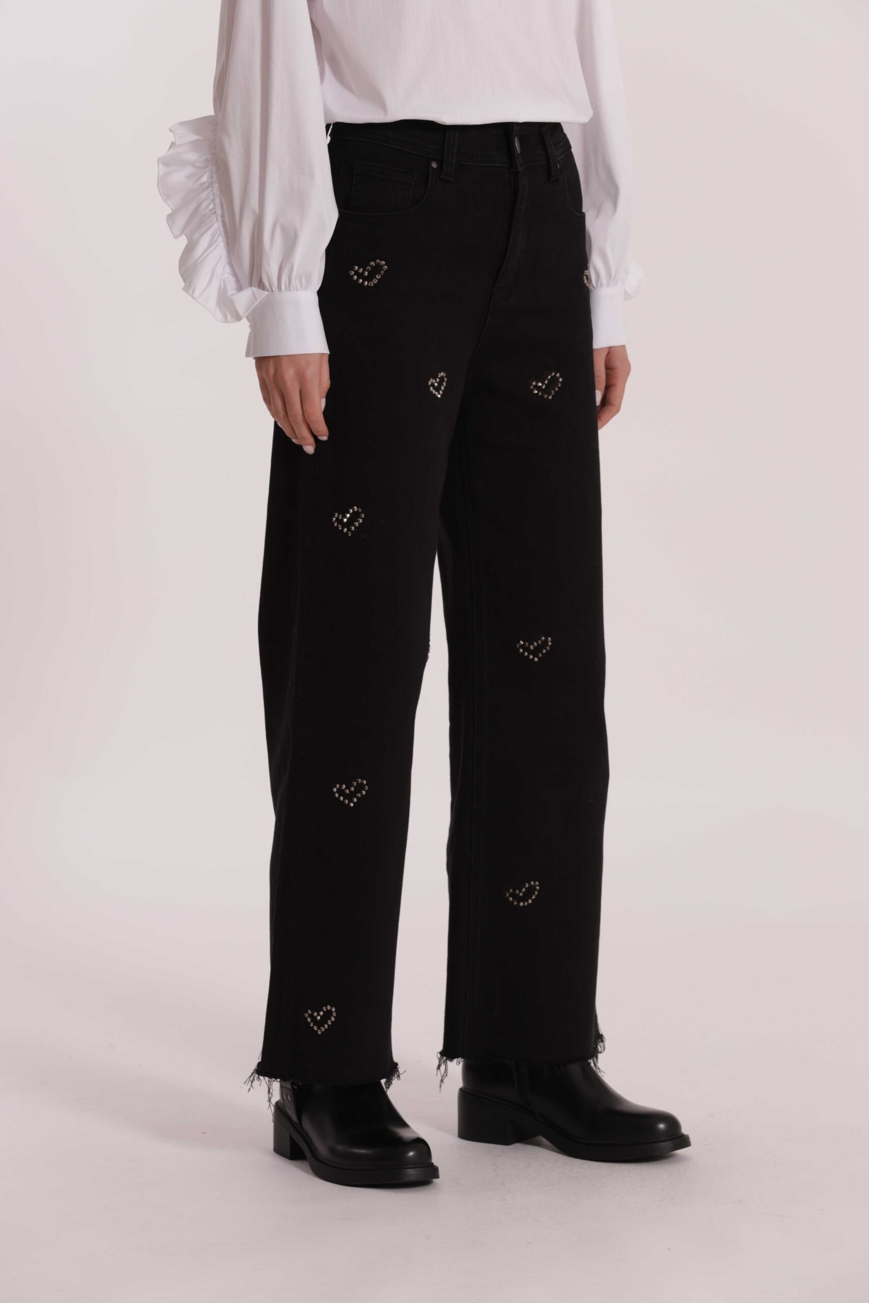 Trend di stagione e base perfetta per una miriade di look è il jeans wide leg con applicazione frontale di cuori in strass.