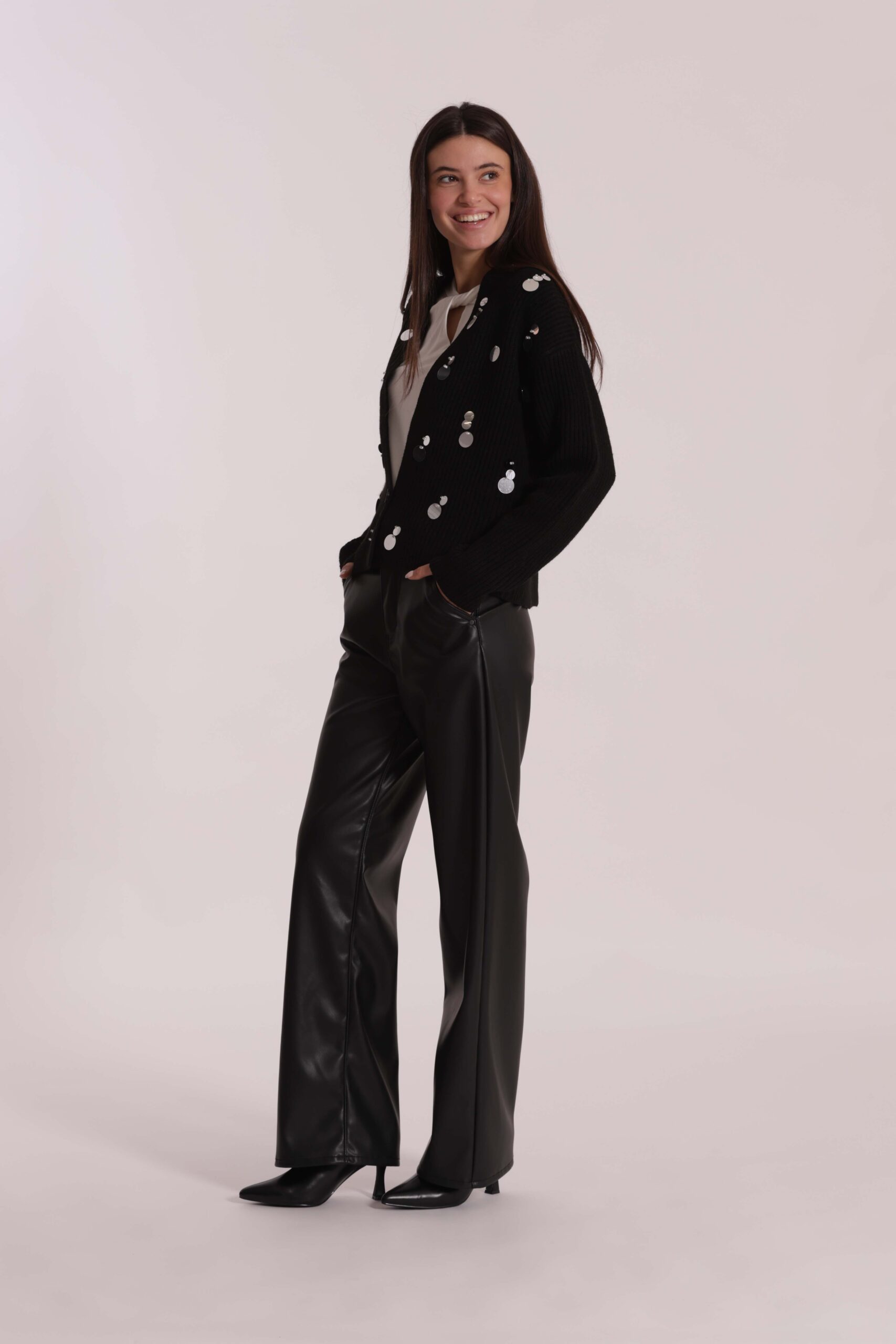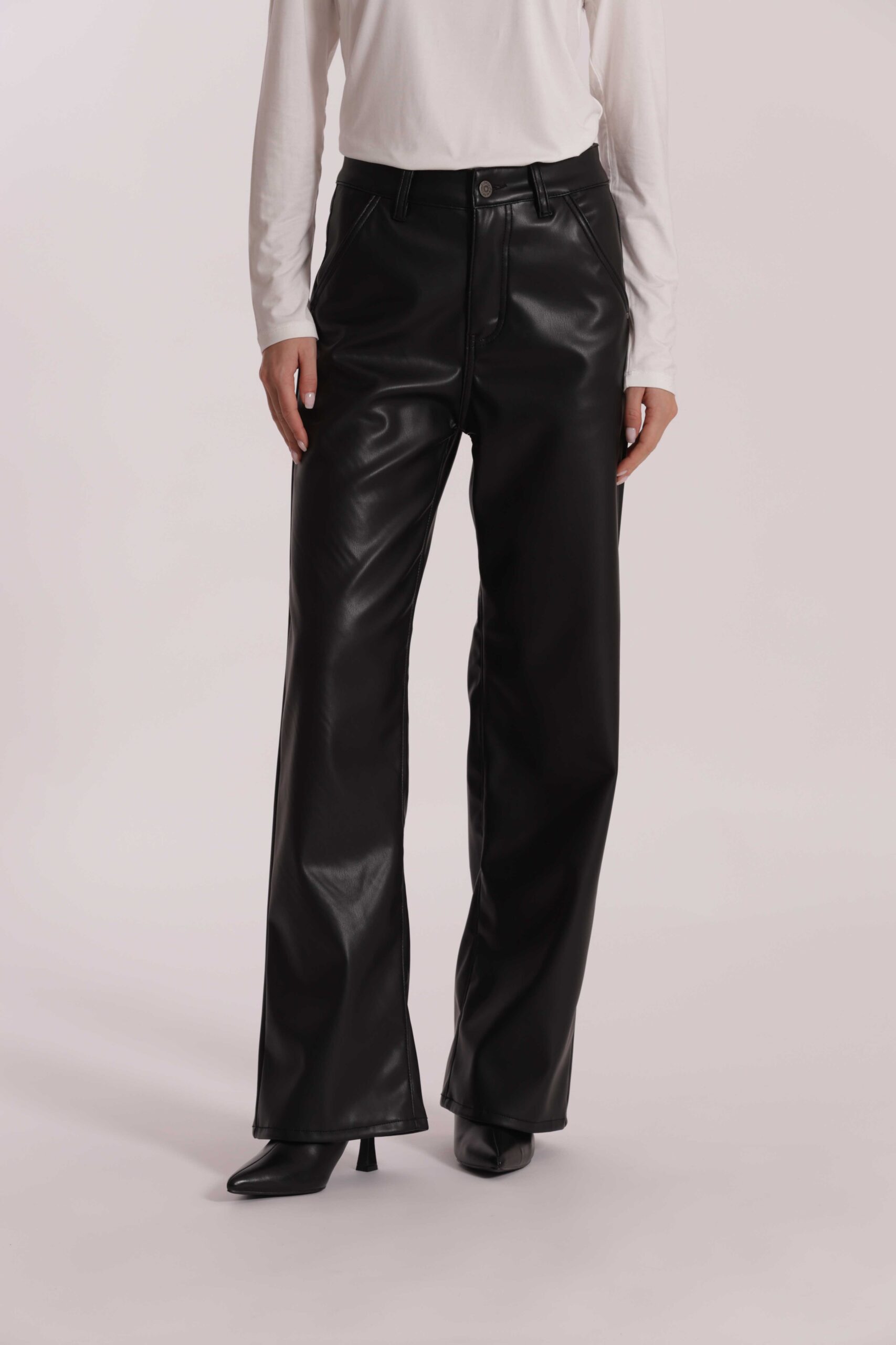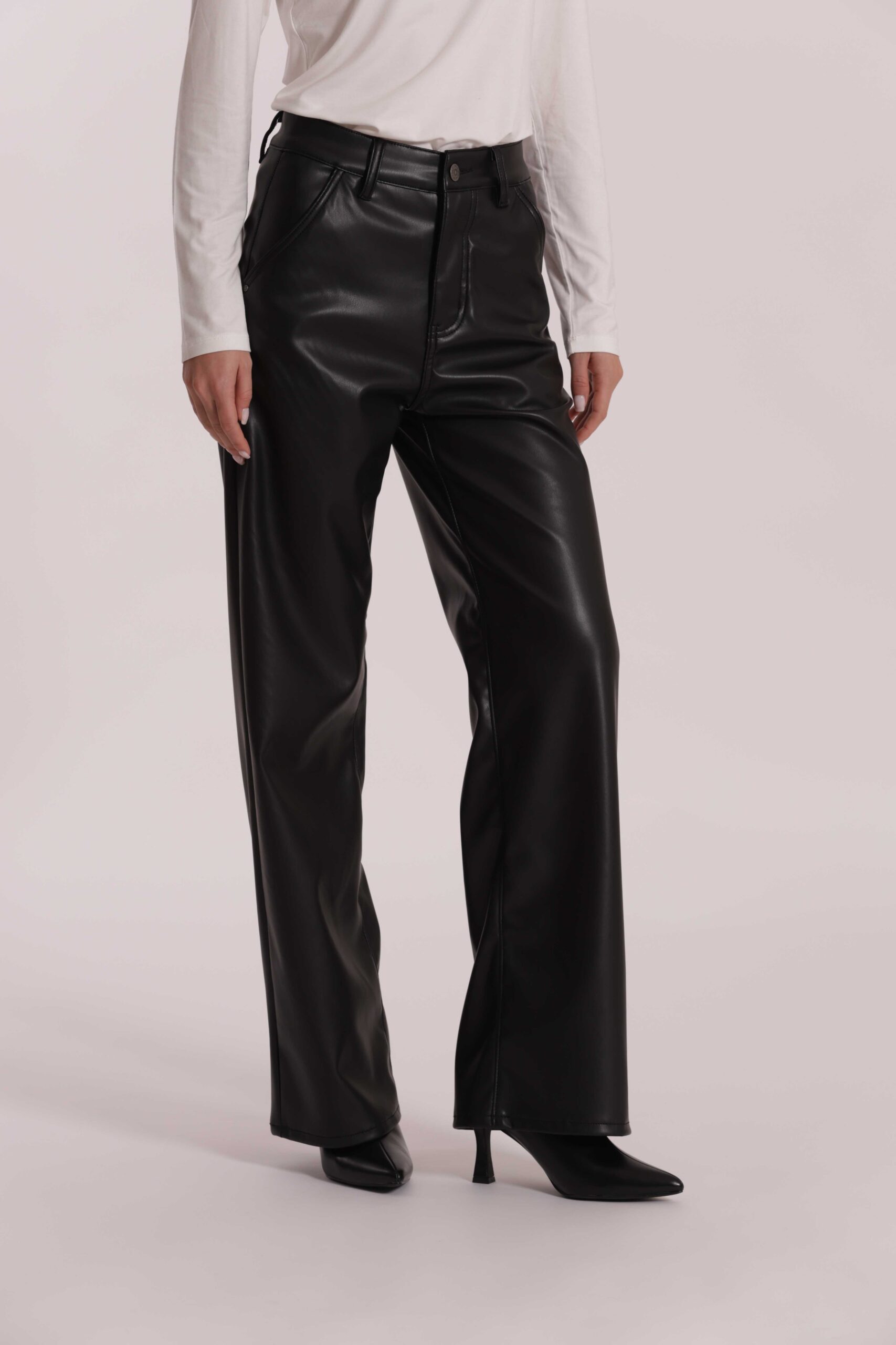 Trend di stagione e base perfetta per una miriade di look è il pantalone wide leg in simil pelle dalla mano soffice.