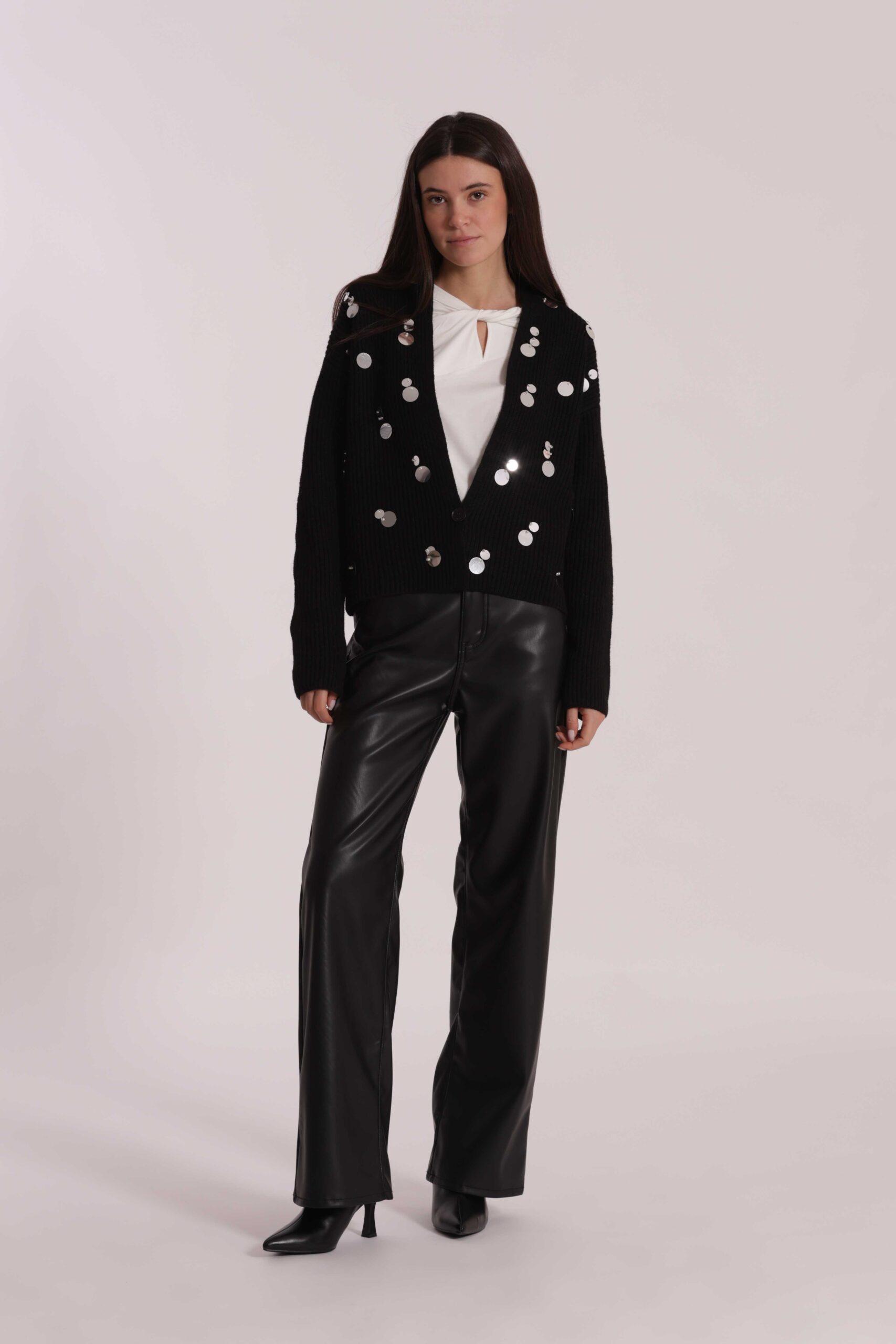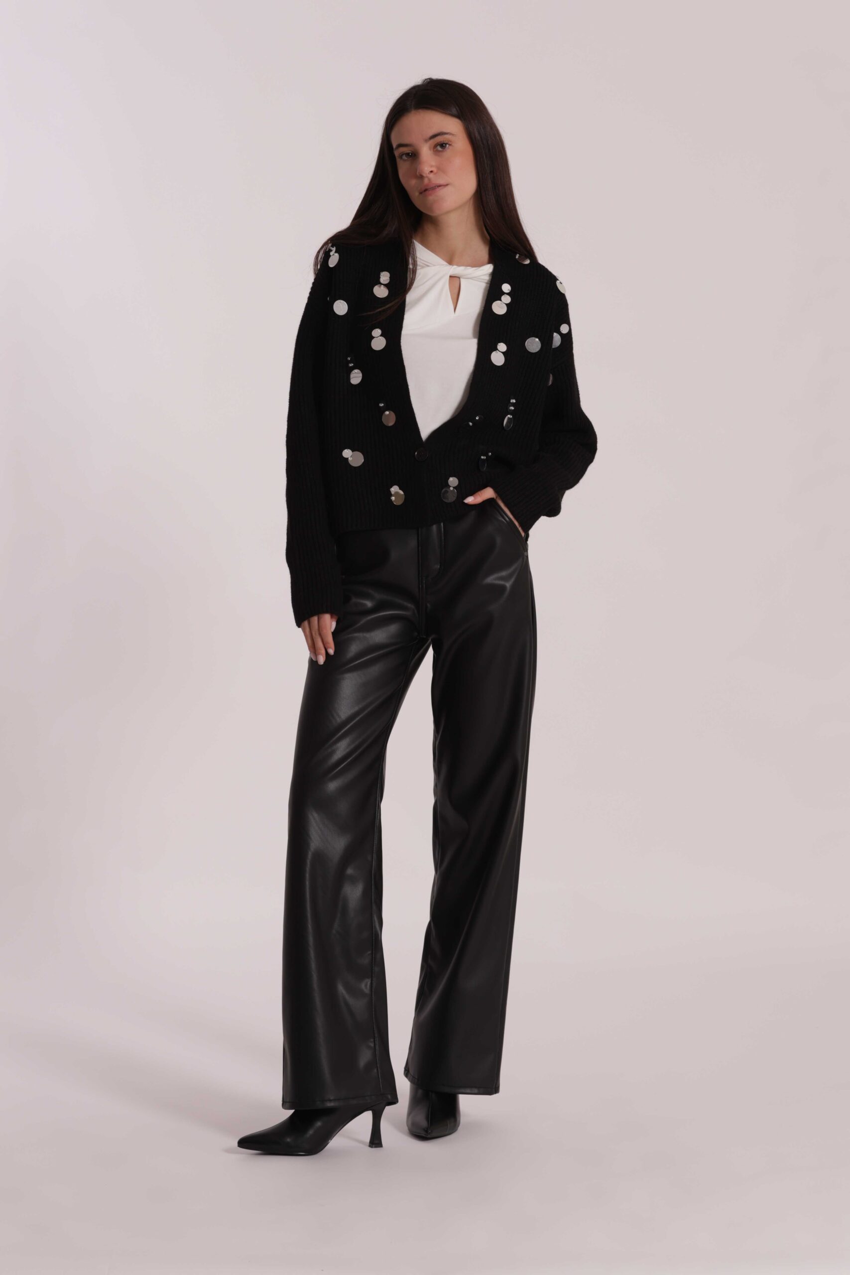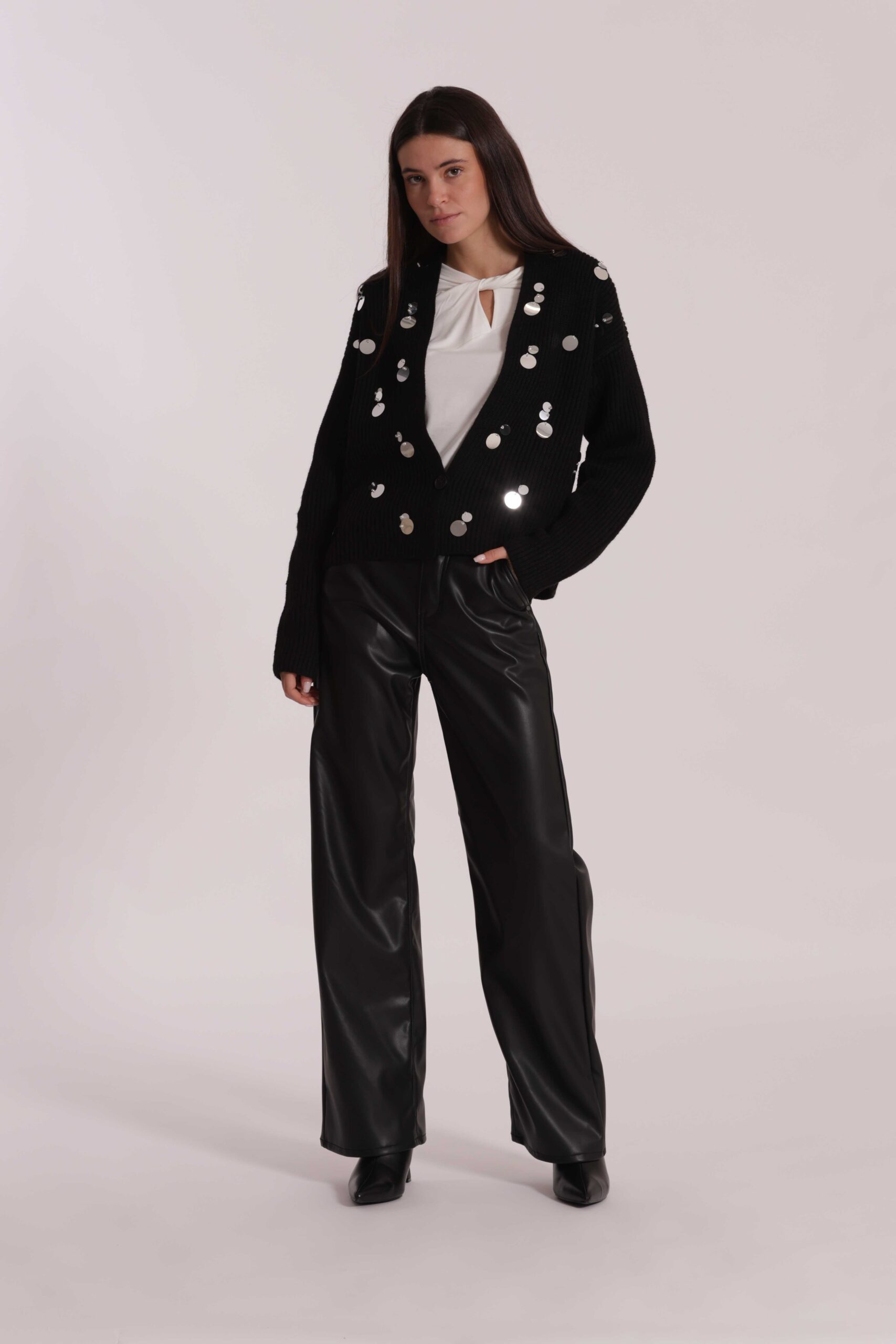 Trend di stagione e base perfetta per una miriade di look è il pantalone wide leg in simil pelle dalla mano soffice.