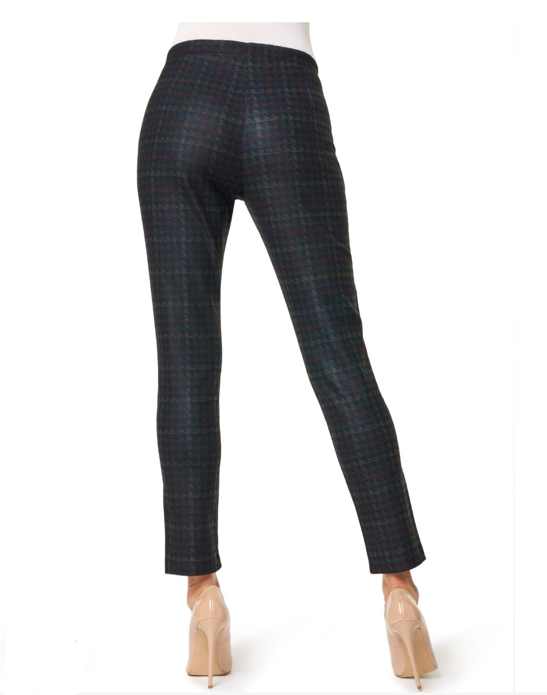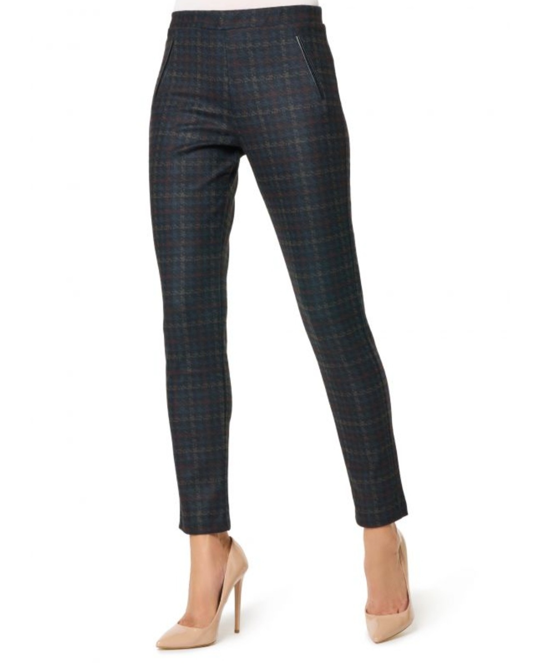Pantalone donna moda in punto milano flanellato con viscosa, fantasia pied-de-poule con finte tasche profilate in finta pelle sul fronte. Elastico in vita.