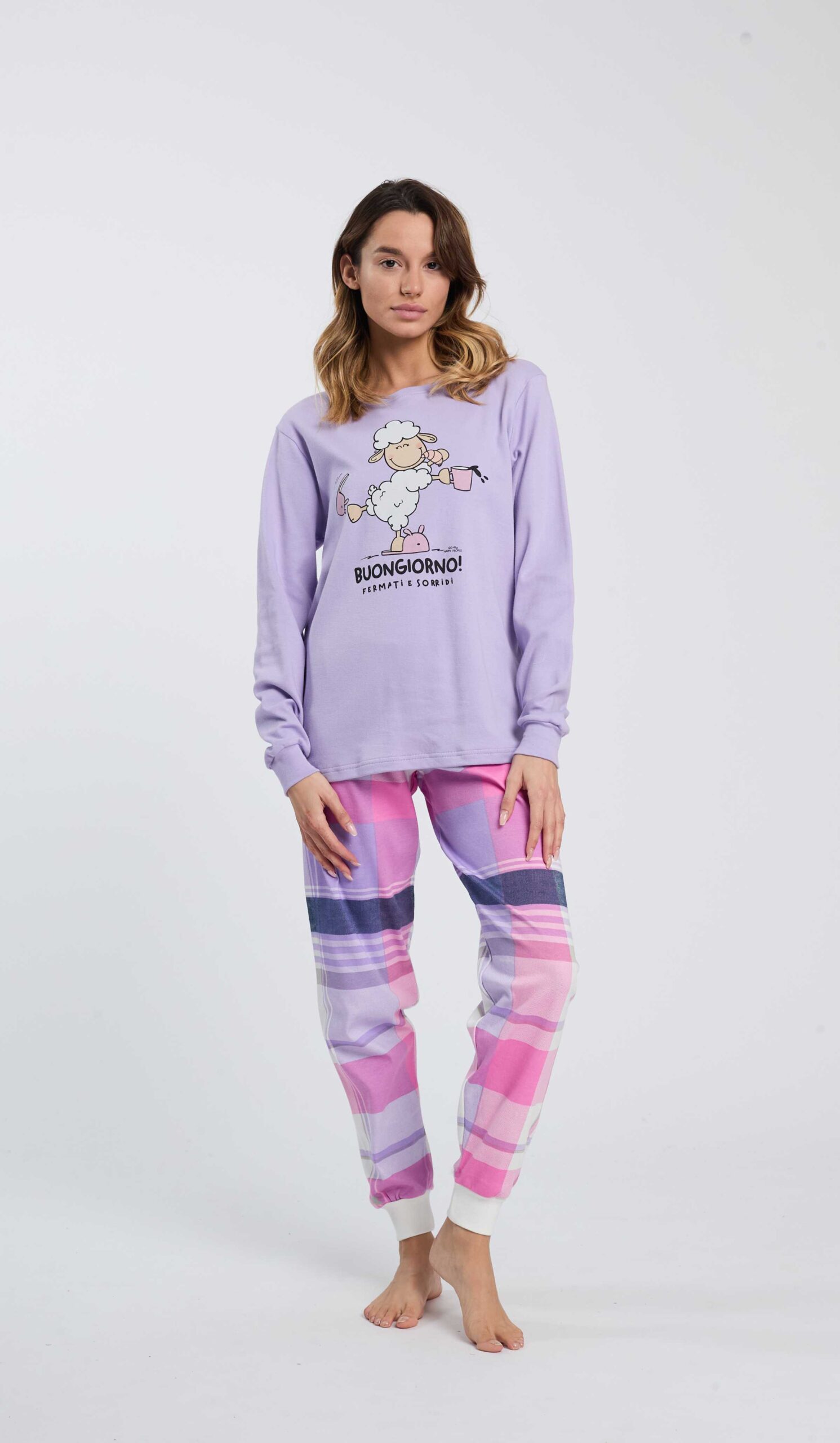 PIGIAMA DONNA HAPPY PEOPLE CALDO COTONE “BUONGIORNO” MAGLIA LILLA CON STAMPA E PANTALONE A SCACCHI