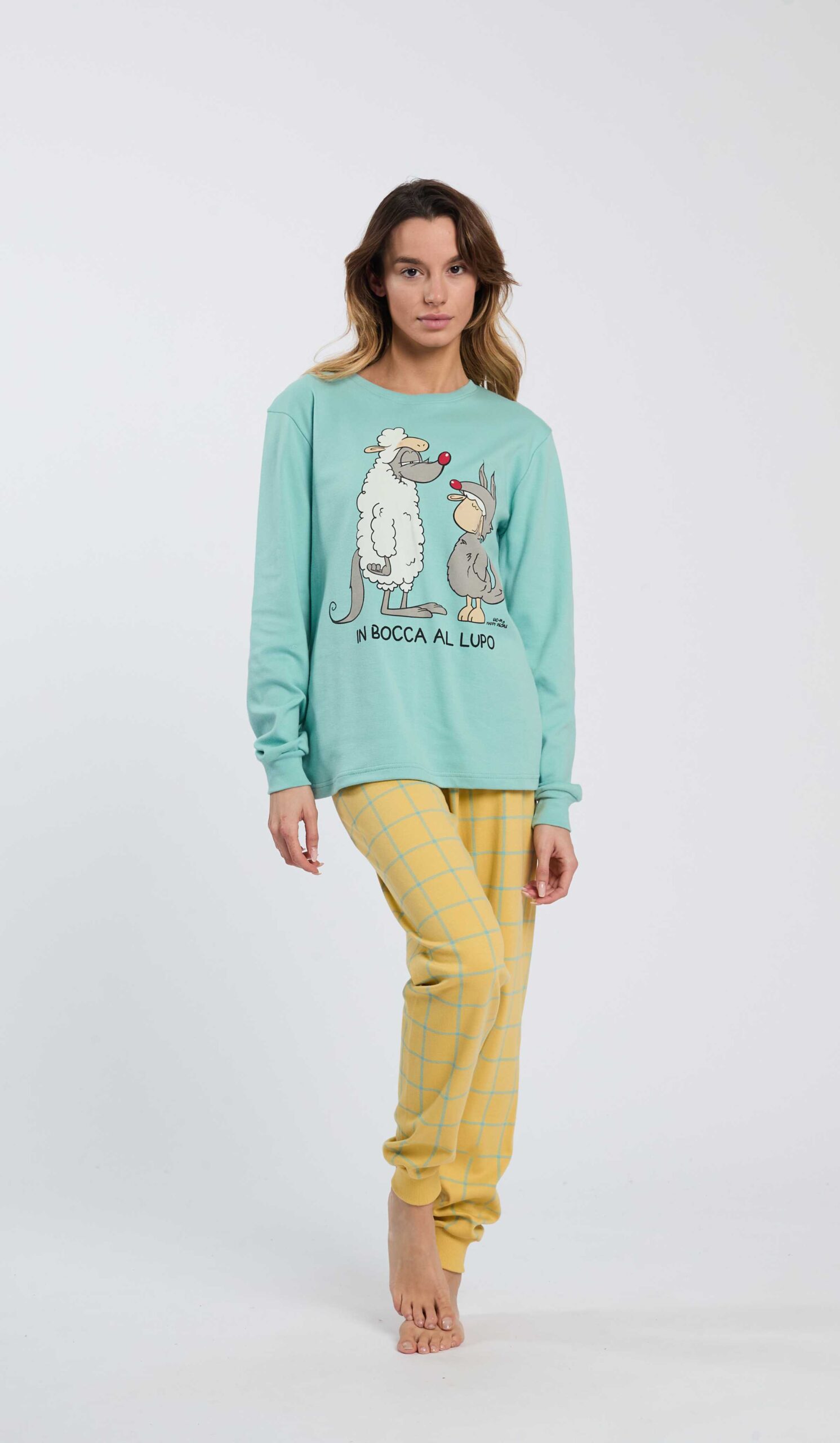 PIGIAMA DONNA HAPPY PEOPLE IN CALDO COTONE “IN BOCCA AL LUPO” CON PANTALONE GIALLO A SCACCHI