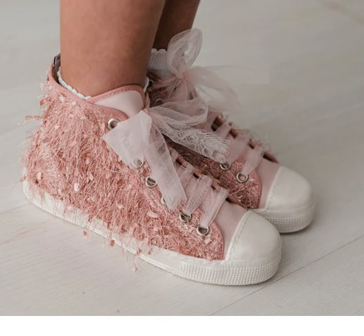Sneaker made in Italy modello alto in tessuto con fronzolo, Stringhe in tulle, Cerniera laterale