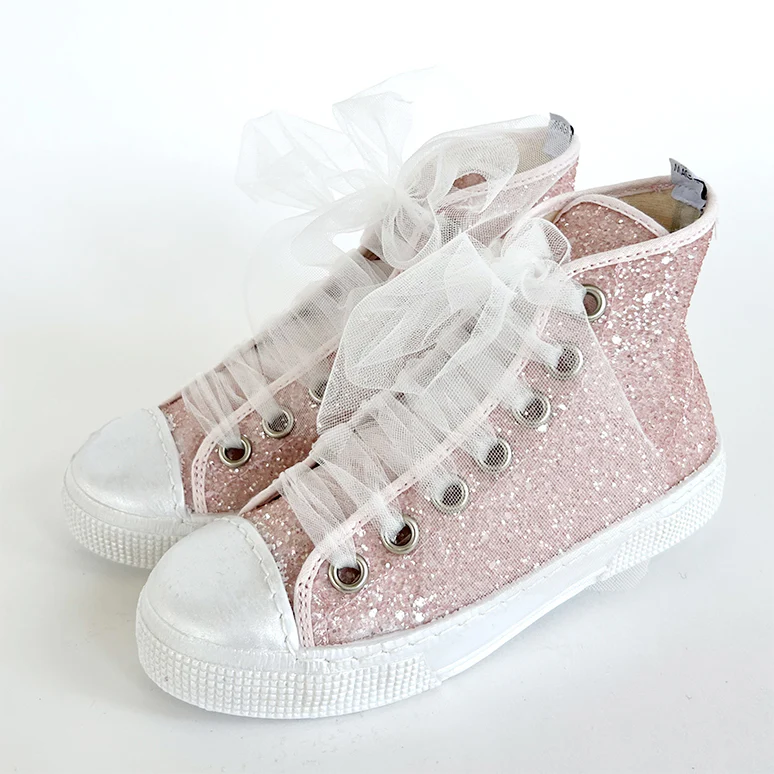 Sneakers Made in Italy, modello alto in tessuto glitter. Tomaia in colore bianco. Suola perlata tinta a mano. Chiusura con stringhe di tulle. Sottopiede memory foam. Tomaia: Sintetico Fodera: Sintetico Suola: Gomma Sottopiede: Sintetico