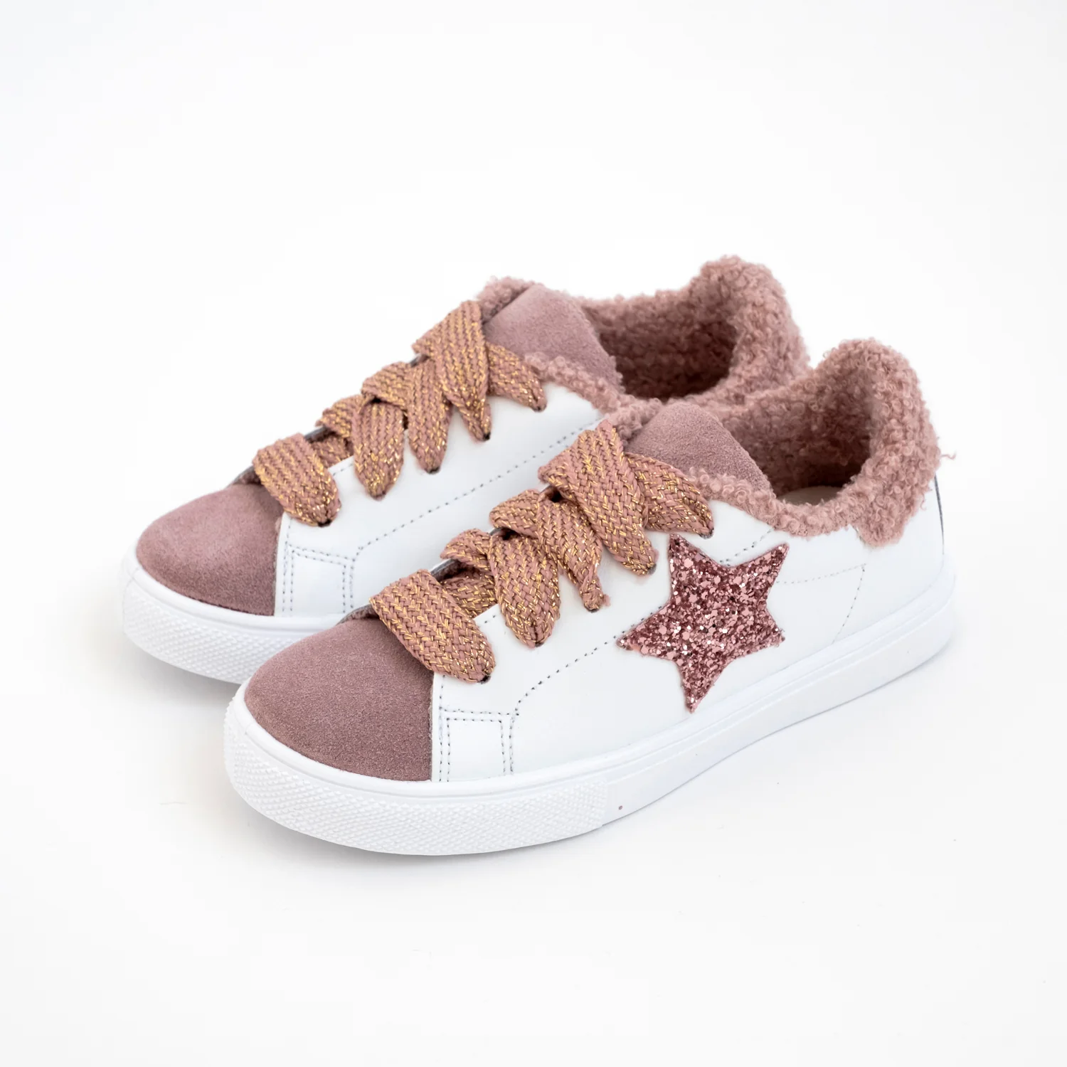 Sneakers Made in Italy in pelle bycast. Dettagli in pelle scamosciata, glitter e tessuto orsetto (96% POLIESTERE 4%ELASTANO). Modello basso. Suola in gomma. Chiusura con stringhe.