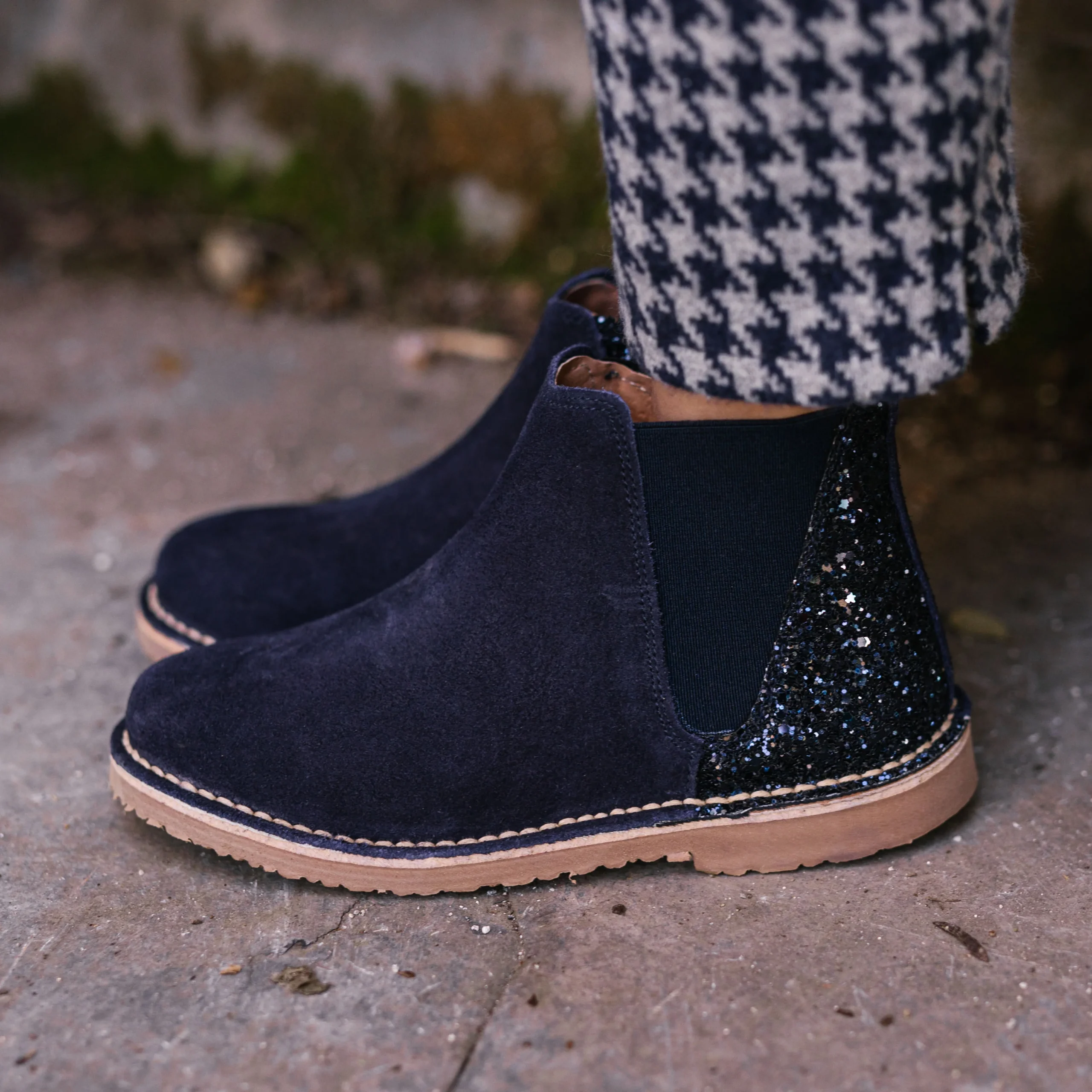 Stivaletto con tomaia in pelle scamosciata e glitter. Foderata in pelle. Soletta con schiuma per un maggiore comfort. Suola rugosa color caramello.