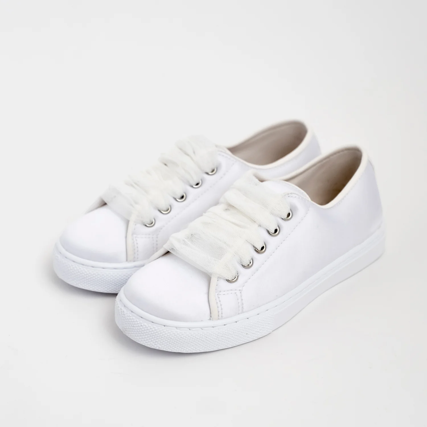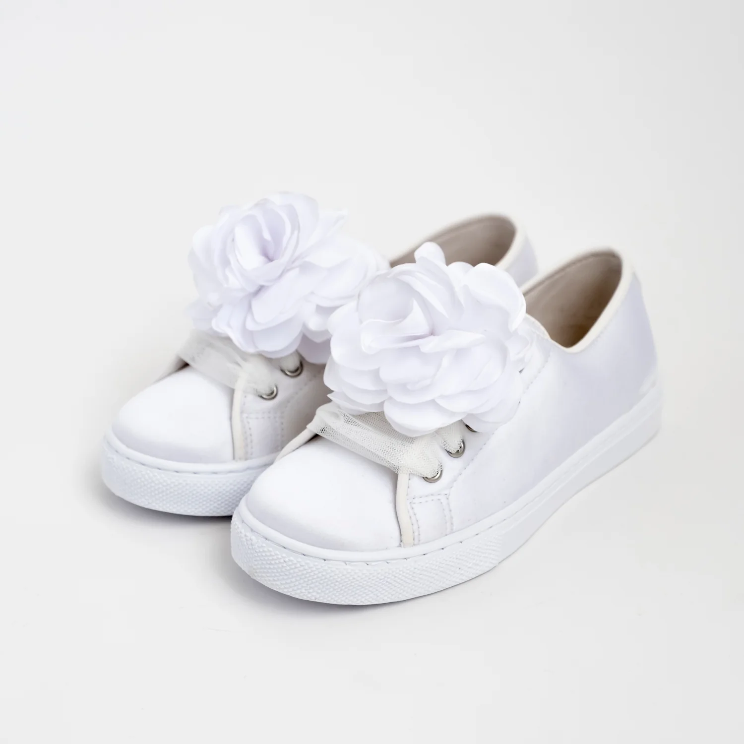 Sneakers modello basso in raso con stringhe tulle glitter. Applicazione fiore.