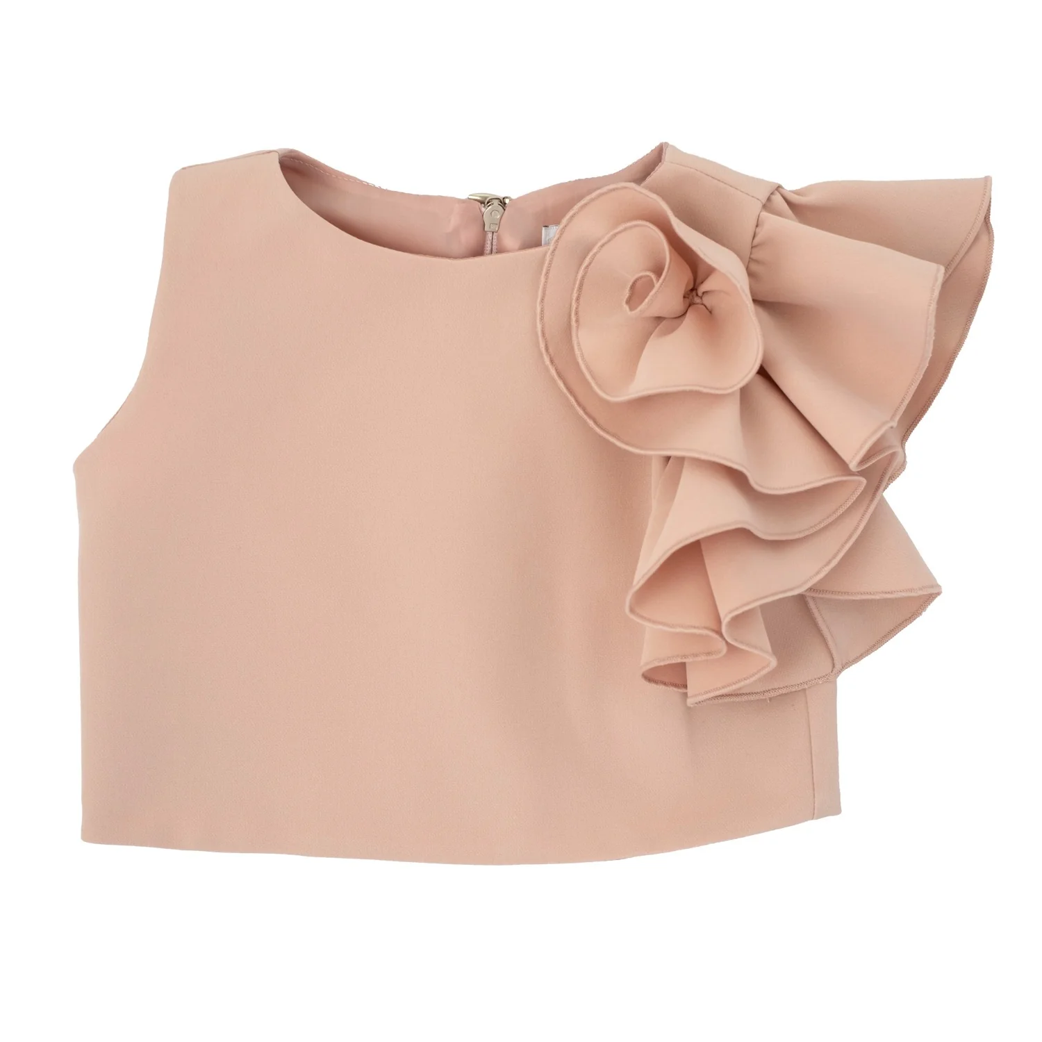 Top in tessuto stretch elegante, Dettaglio balza con fiore, Girocollo, Chiusura sul retro con zip invisibile