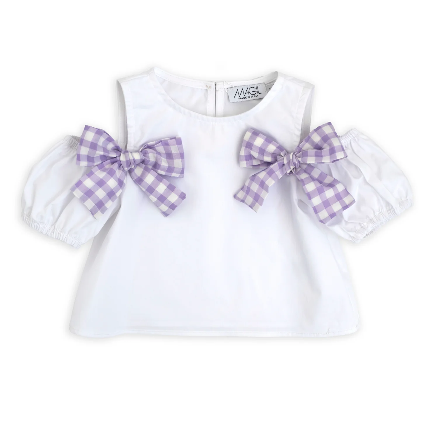 Top in popeline di cotone, Manica scesa arricciata con dettaglio fiocchi vichy, Chiusura sul retro con bottoncino in madreperla