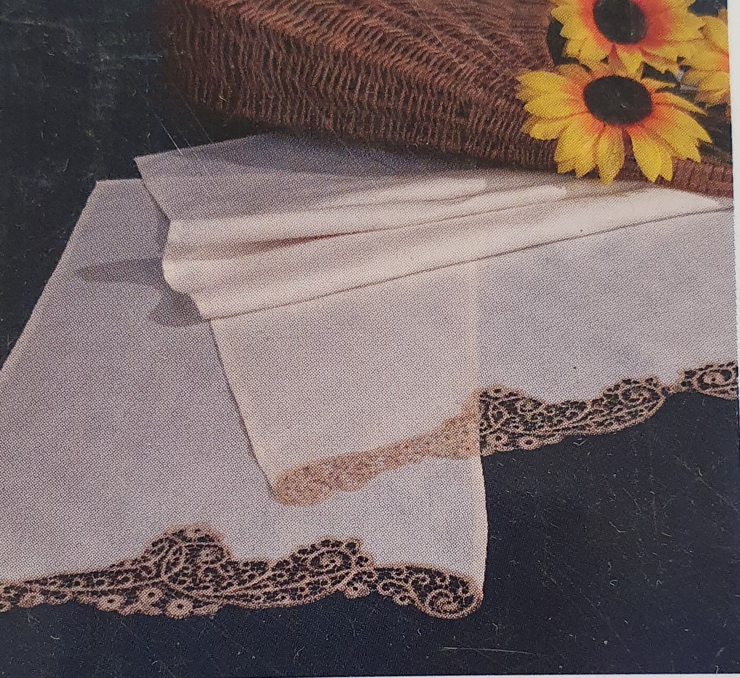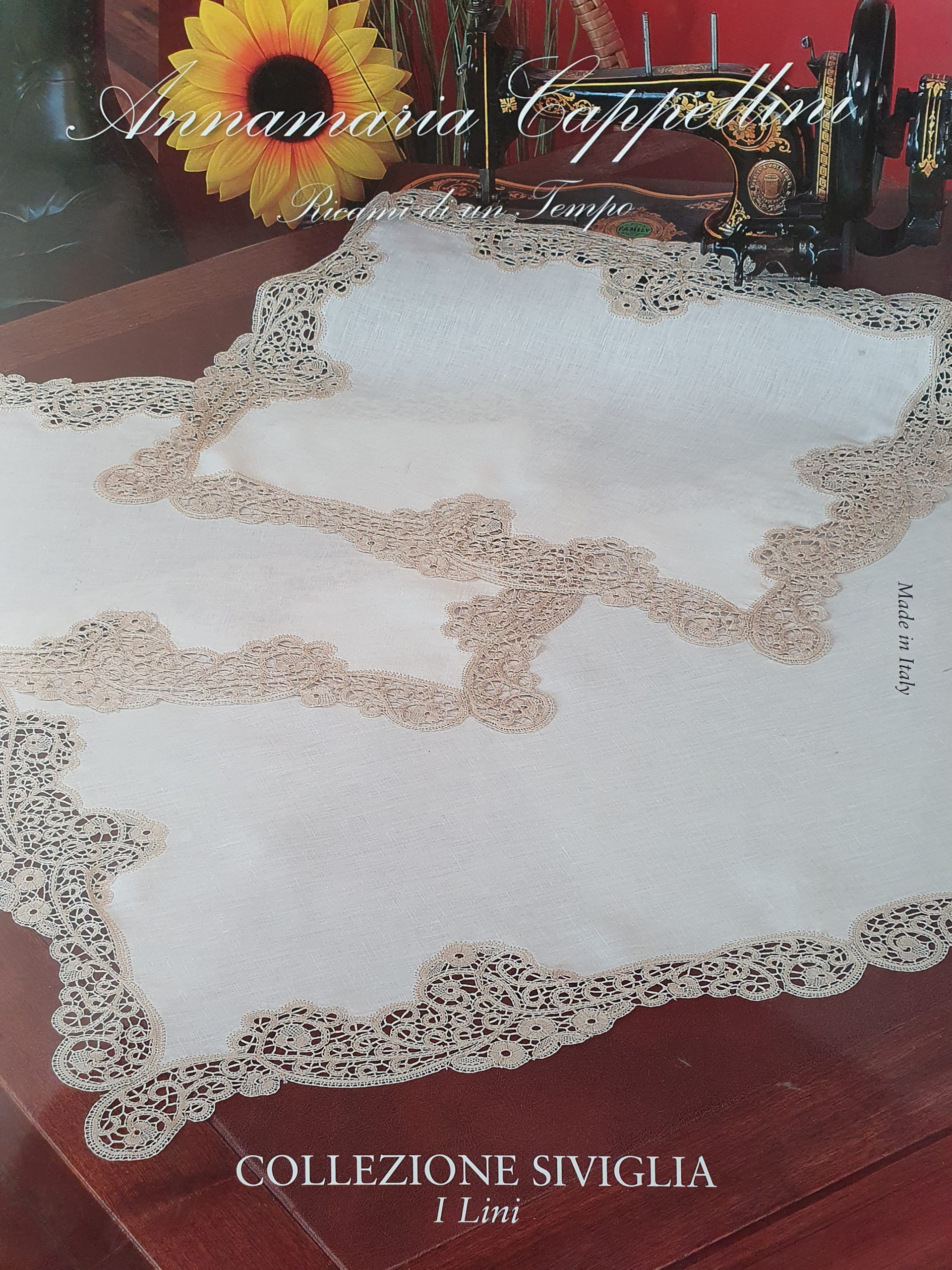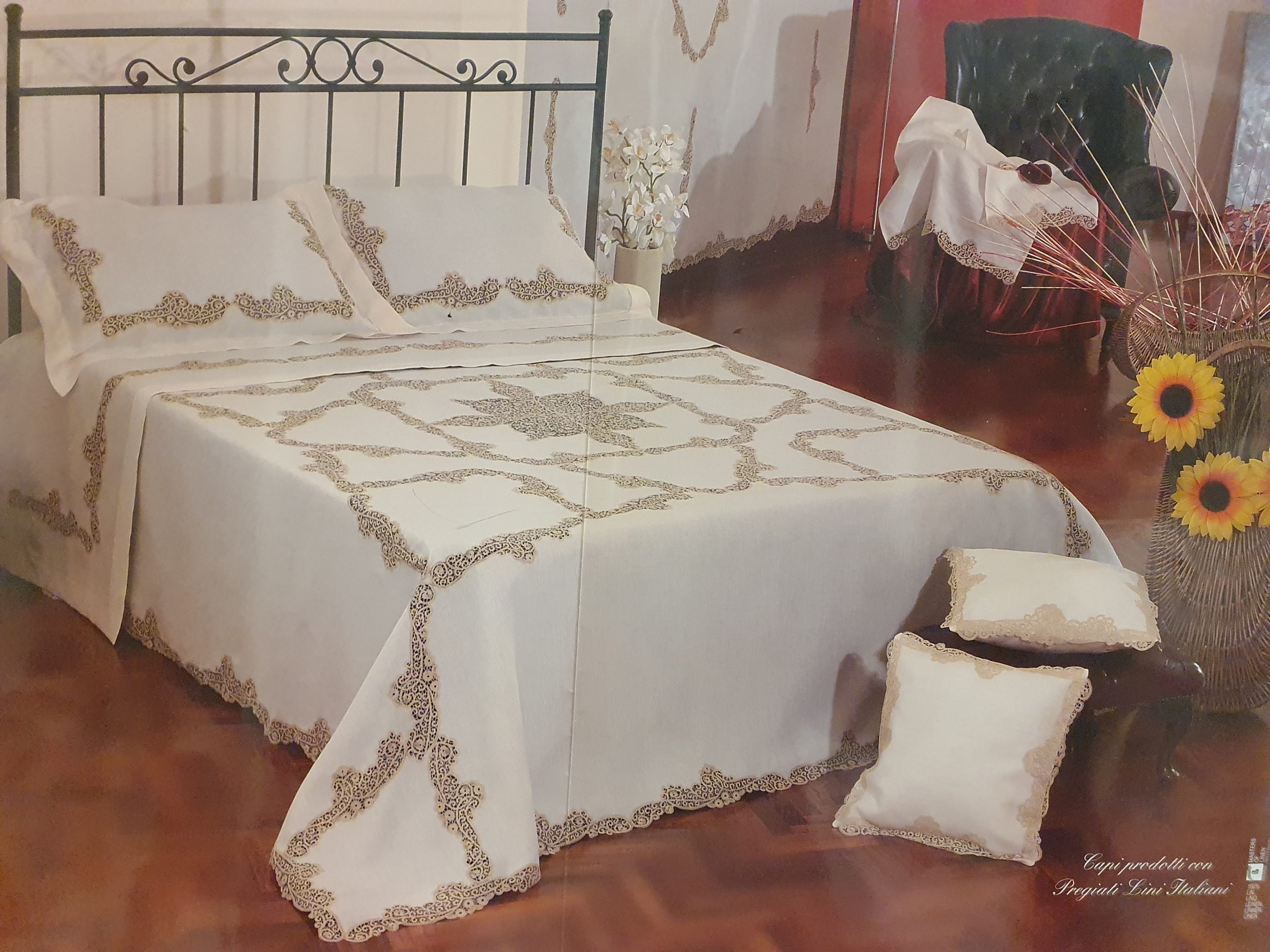 TRIS CANTU’ – COPRILETTO IN PURO LINO 100% CON APPLICAZIONI DI PIZZO CANTU’ LAVORATO E RITAGLIATO A MANO MISURA 270X280; LENZUOLO IN PURO LINO 100% CON ORLO A GIORNO E BALZA IMPREZIOSITA DA APPLICAZIONI IN PIZZO CANTU’, MISURA 270X300; COPPIA DI FEDERE IN PURO LINO RIFINITE CON APPLICAZIONI DI PIZZO CANTU’, MISURE 50X80+ BALZA 5CM.; TOVAGLIA DA TAVOLA X 12 IN PURO LINO CON APPLICAZIONI PIZZO CANTU’ LAVORATO E RITAGLIATO A MANO, MISURA 180X280 CON 12 TOVAGLIOLI IN PURO LINO MIS. 40X40