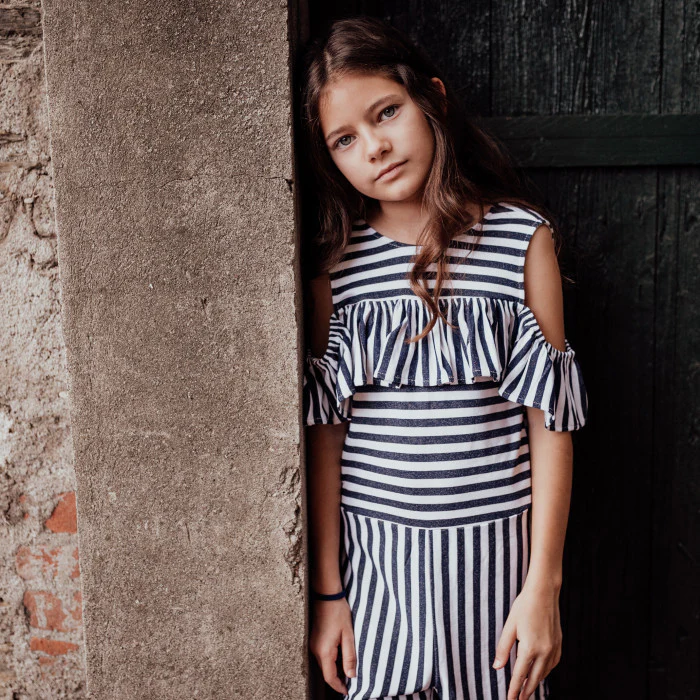 Tutina in felpina rigata bianco/blu Dettaglio volant sulla spalla Tagliata in vita Composizine: 96%VI 4%EA